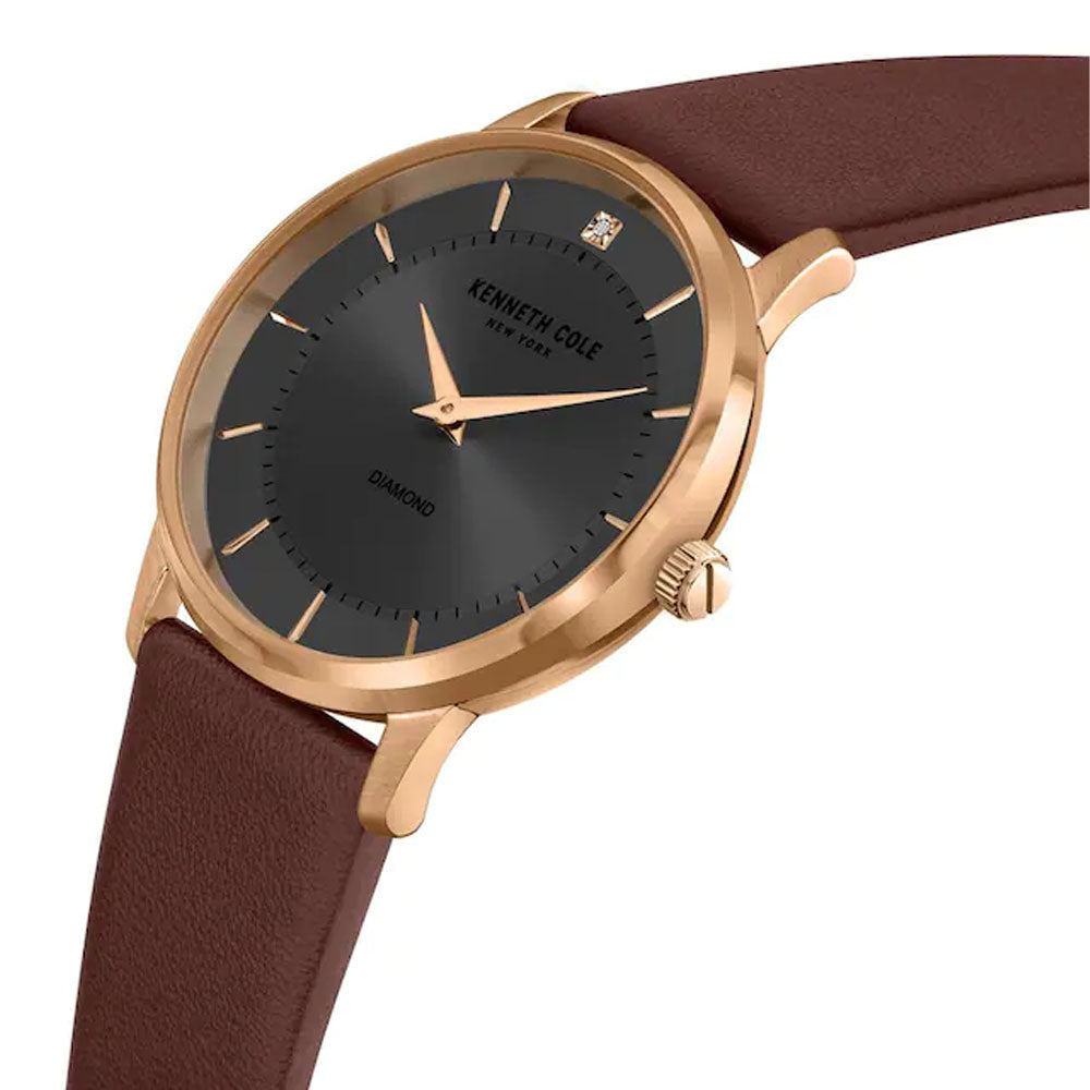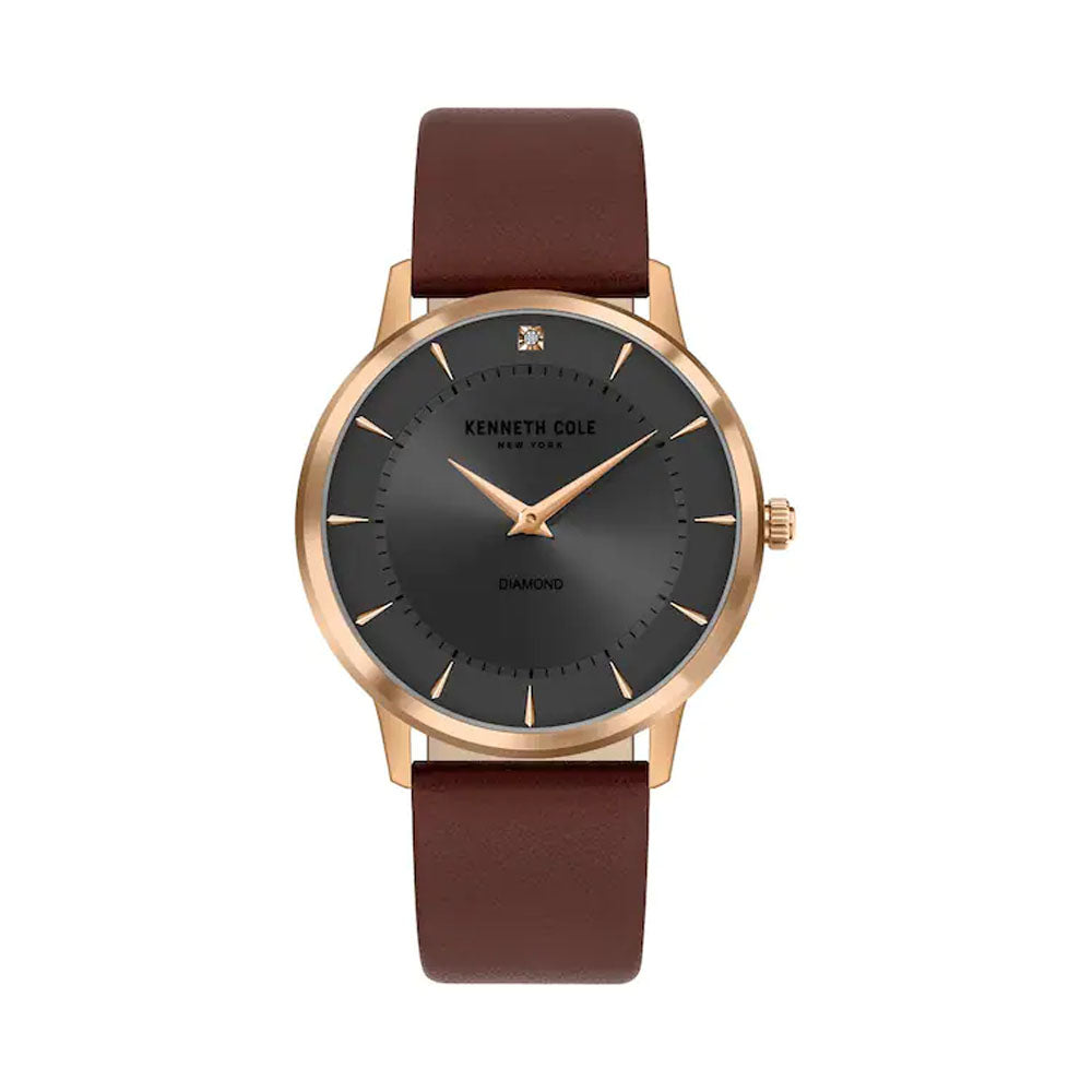 Combining simplicity and performance, this men's analog watch from the Modern Classic collection by Kenneth Cole is sure to impress you. Enclosed in a 42 mm case, the grey round dial is secured by a mineral glass. It displays plain two hands and a crown for time adjustment. The genuine leather strap exudes a brown hue that accentuates the look of the watch. Besides, it is finished with a buckle clasp to provide a secure fit on the wrist.