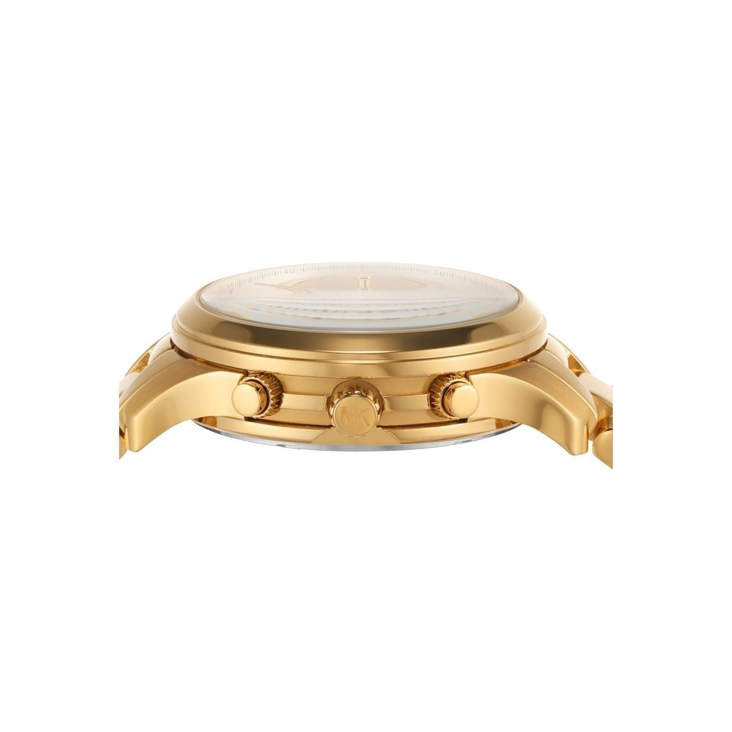 This MK7326 Runway Chronograph watch features a stunning gold-tone stainless steel design, ideal for any occasion. Its refined chronograph movement with clear numerals enhances both style and functionality. The mineral glass protects the striking gold round dial, ensuring durability and elegance. With a secure fold-over clasp design, this watch promises comfort while accentuating your wrist.