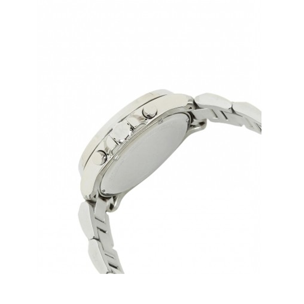 Stainless steel case with a two- tone (silver and gold-tone) stainless steel bracelet. Uni-directional rotating stainless steel bezel. Blue dial with gold-tone hands and Roman numeral hour markers. Minute markers around the outer rim. Dial Type: Analog. Luminescent hands. Date display between the 4 and 5 o'clock positions. Chronograph - three sub-dials displaying: 60 seconds, 60 minute, and 24 hours. Quartz movement. Scratch resistant mineral crystal. Pull / push crown. Solid case back. Case diameter: 44 mm. Case thickness: 12 mm. Round case shape. Band width: 22 mm. Band length: 8 inches. Deployment clasp with a push button release. Water resistant at 100 meters / 330 feet. Functions: chronograph, date, hour, minute, second. Dress watch style.