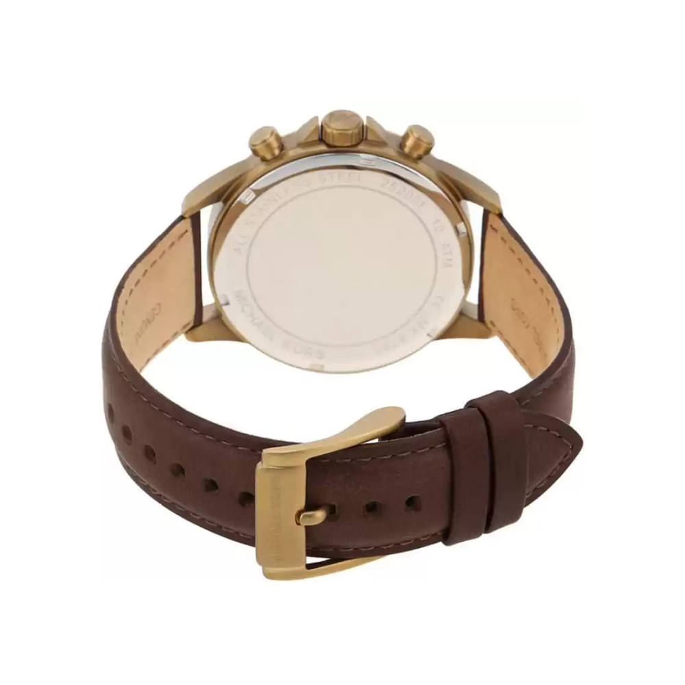 Steal the show with this sophisticated wristwatch which consist of chronograph dial for an elevated take on Michael Kors watch. The contrasting face features chronograph functionality a antique gold plating case with antique gold-tone numeral indexes and chocolate leather strap to finish the look. It is a refine addition to...