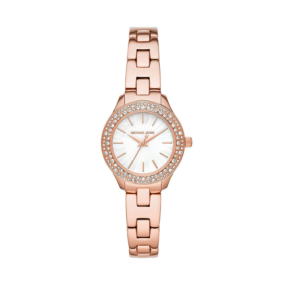 Classic style meets modern finishes in Liliane from Michael Kors. An artful construction inspired by the girl with an alluring charm, this timepiece puts a sophisticated spin on an evergreen design. The mother of pearl dial and glitzy top ring take centre stage in this rose gold-toned watch with tonal indexes and three hand movement.