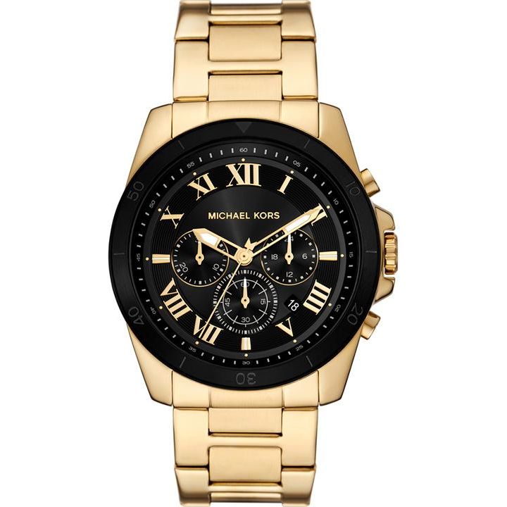 Michael Kors' 44mm Alek watch features a black brushed sunray dial, chronograph movement and gold-tone stainless steel bracelet.