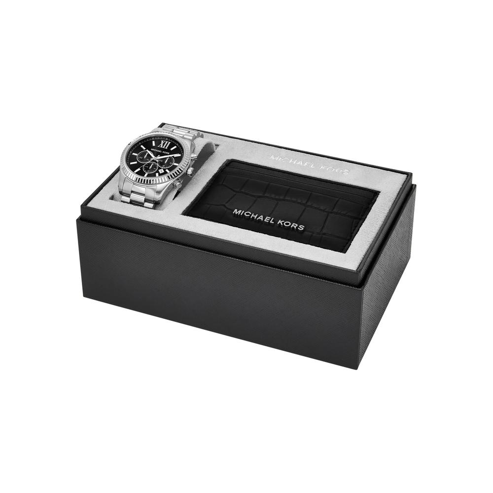 This gift set features a 44mm Lexington chronograph watch with a stainless steel bracelet and a black croco leather card case. Amaze everyone around you by wearing this mens analog watch from the collection by Michael Kors. The black round dial is protected by a mineral glass. It features a...