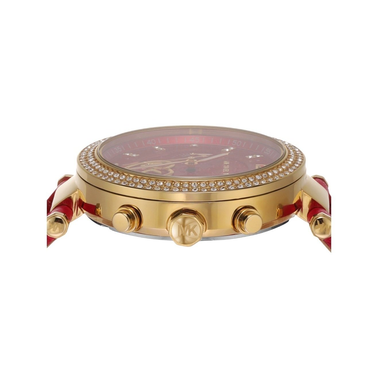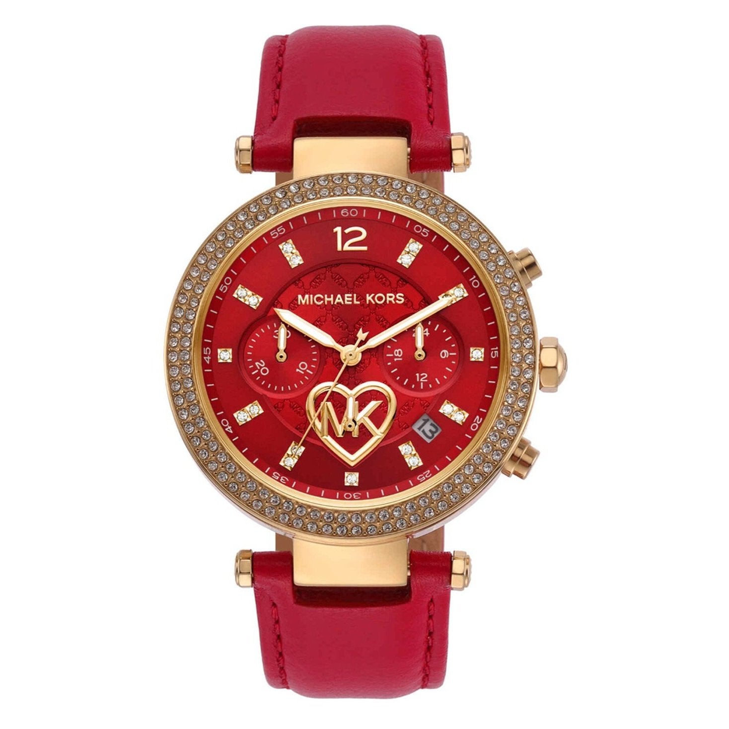 Add the perfect finishing touch to your look with this women's analog watch from Michael Kors. The red round dial is protected by a mineral glass. Michael Kors' 39mm Parker watch features a red dial with a logo heart detailing, pave topring, chronograph and red leather strap. Besides, it is...