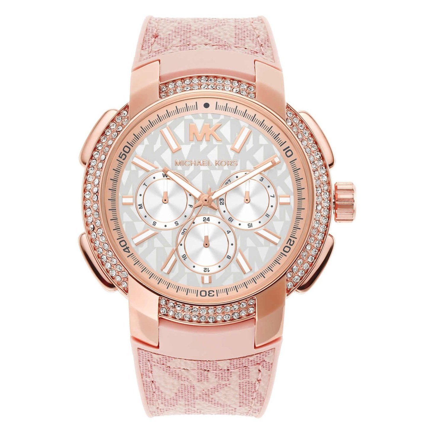 This signature logo pvc print gets an update in ballet pink inlaid on a blush silicone strap on this 42mm Sidney. The logo doesn't stop there, as it extends onto the dial with a stunning novelty print. paired back to a rose gold-tone case with a pave topring, this bold watch is the epitome of sport-luxe style.