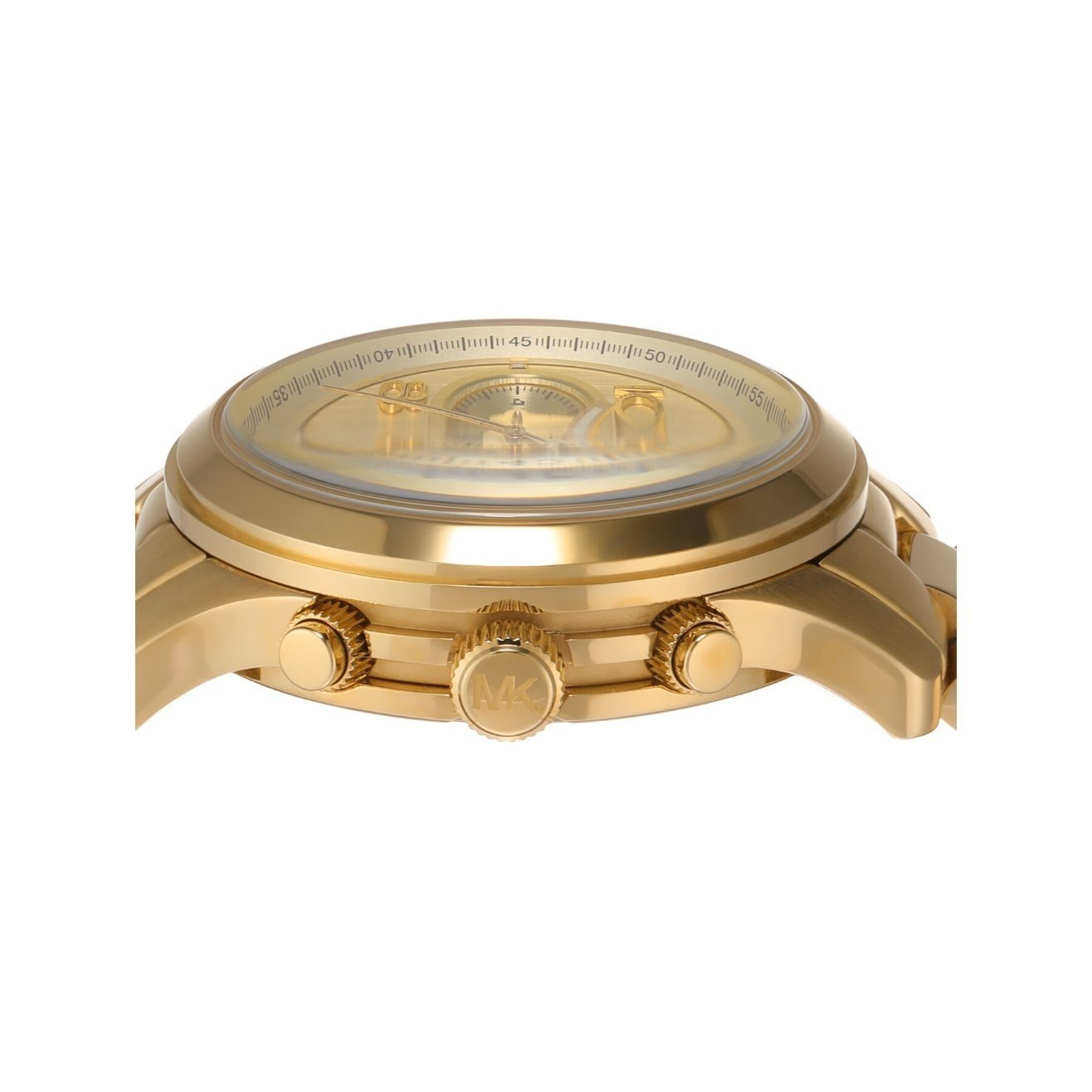 Enhance your style quotient by wearing this women's analog watch from Michael Kors. The gold round dial is protected by a mineral glass. The Iconic Runway makes its return in this 38mm gold-tone stainless steel watch. Featuring a chronograph with bold numerals on the dial, this watch was designed with...