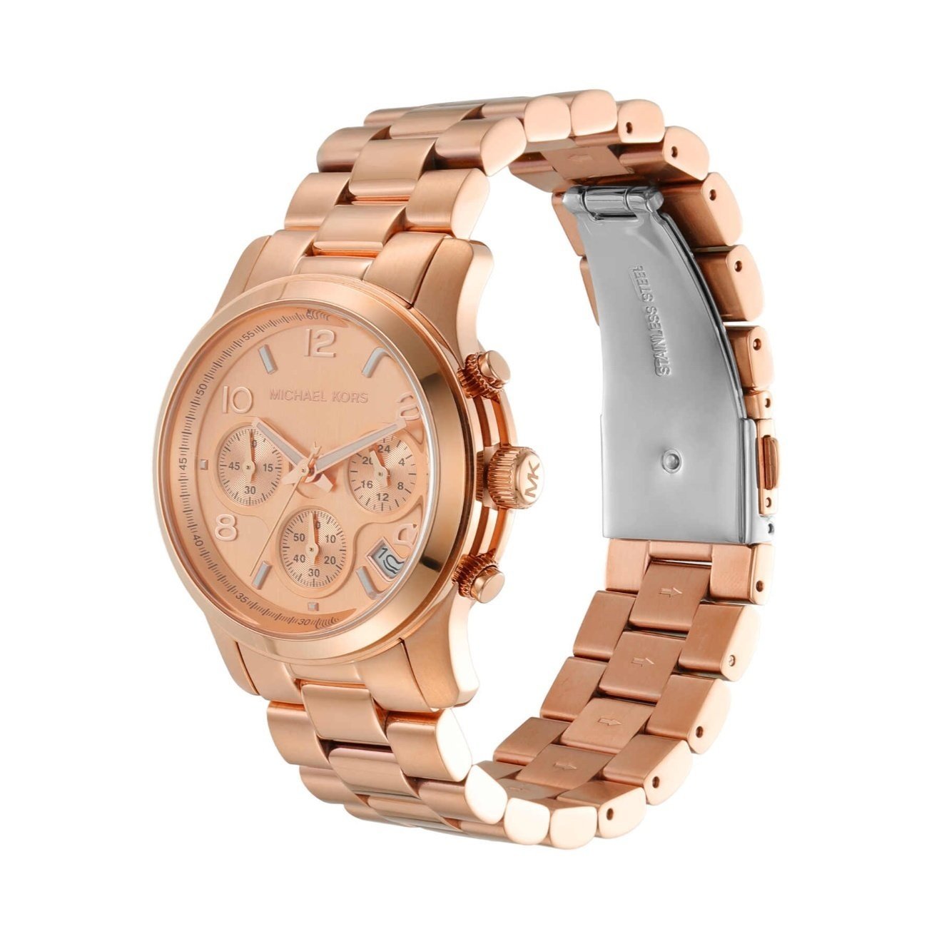 Own this women's analog watch from Michael Kors and keep yourself updated with the latest trends. The rose gold round dial is protected by a mineral glass. The Iconic Runway makes its return in this 38mm rose gold-tone stainless steel watch. Featuring a chronograph with bold numerals on the dial, this watch was designed with the jet-set lifestyle in mind. Besides, it is completed with a fold-over push button clasp with safety clasp to ensure a secure fit on the wrist.