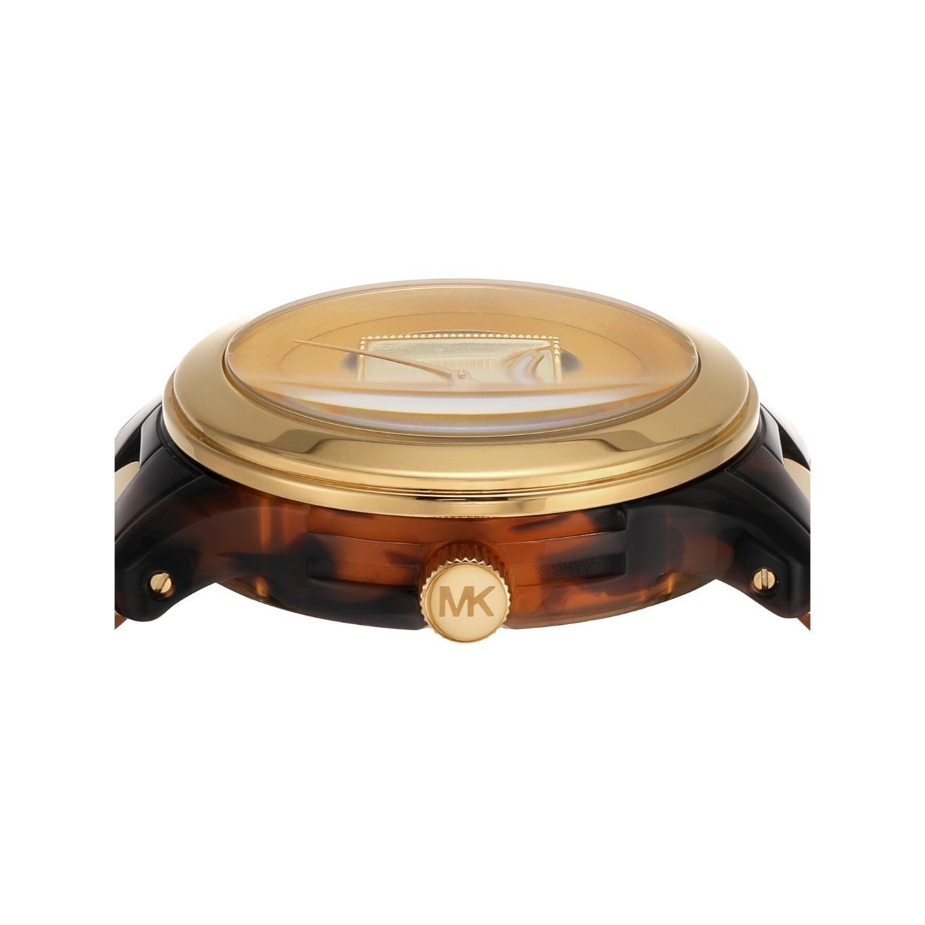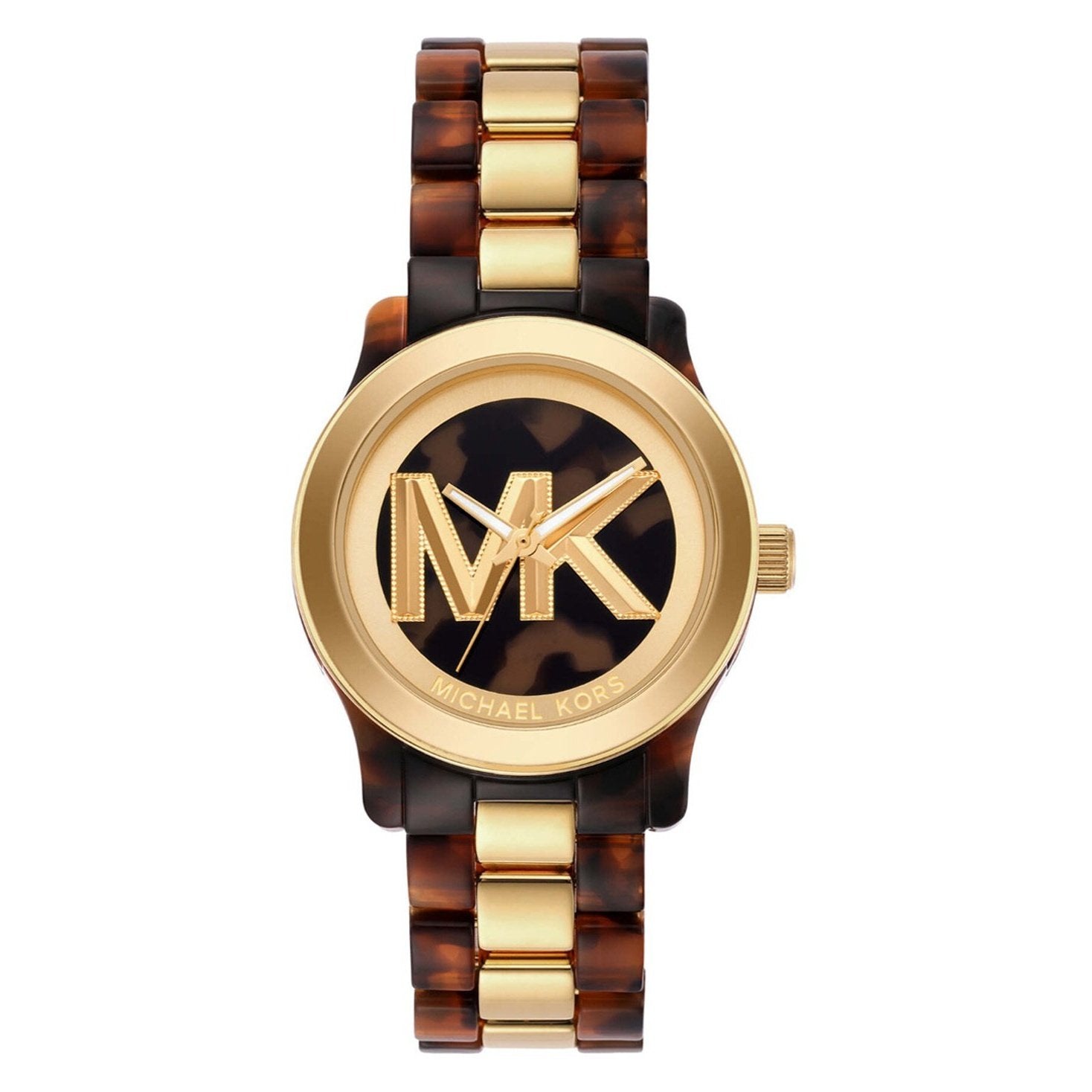 Set in a high shine case, this women's analog watch from Michael Kors is sure to catch your attention. The gold round dial is protected by a mineral glass. The Iconic Runway makes its return in this 38mm tortoise acetate and gold-tone stainless steel watch. Featuring a bold faceted logo...