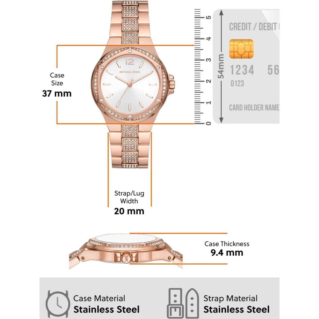 An apt inclusion to keep yourself updated, this women's analog watch from Michael Kors is sure to elevate your look. The white round dial is protected by a mineral glass. Michael Kors' 37mm Lennox watch features a white sunray dial, three-hand and rose gold-tone stainless steel bracelet with pave centerlink....
