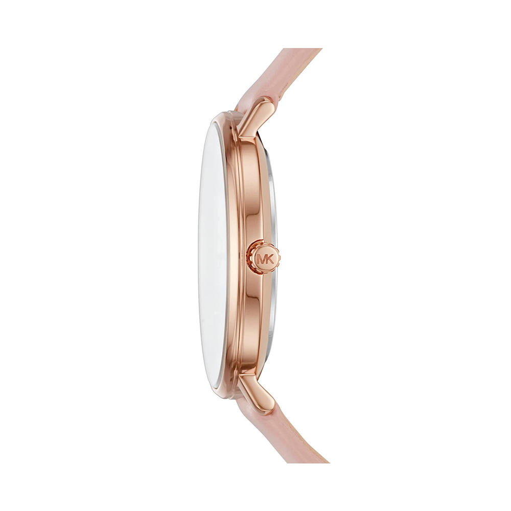 Watch Sizing Guide Find a confident ensemble with the addition of this sleek Michael Kors® Pyper watch. Stainless steel case. Leather strap with adjustable buckle closure. Round face. Three-hand analog display with quartz movement. Dial features gold-tone hands and hour markers, minute track, and Michael Kors detailing. Water resistant 165...