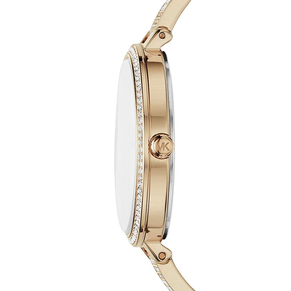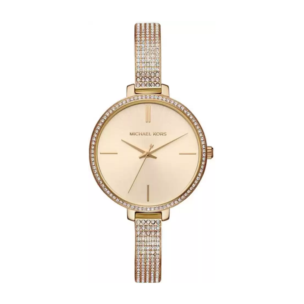 This Michael Kors Jaryn watch features a minimalist gold sunray dial, a pave-embellished case and allover pave half-bangle bracelet.