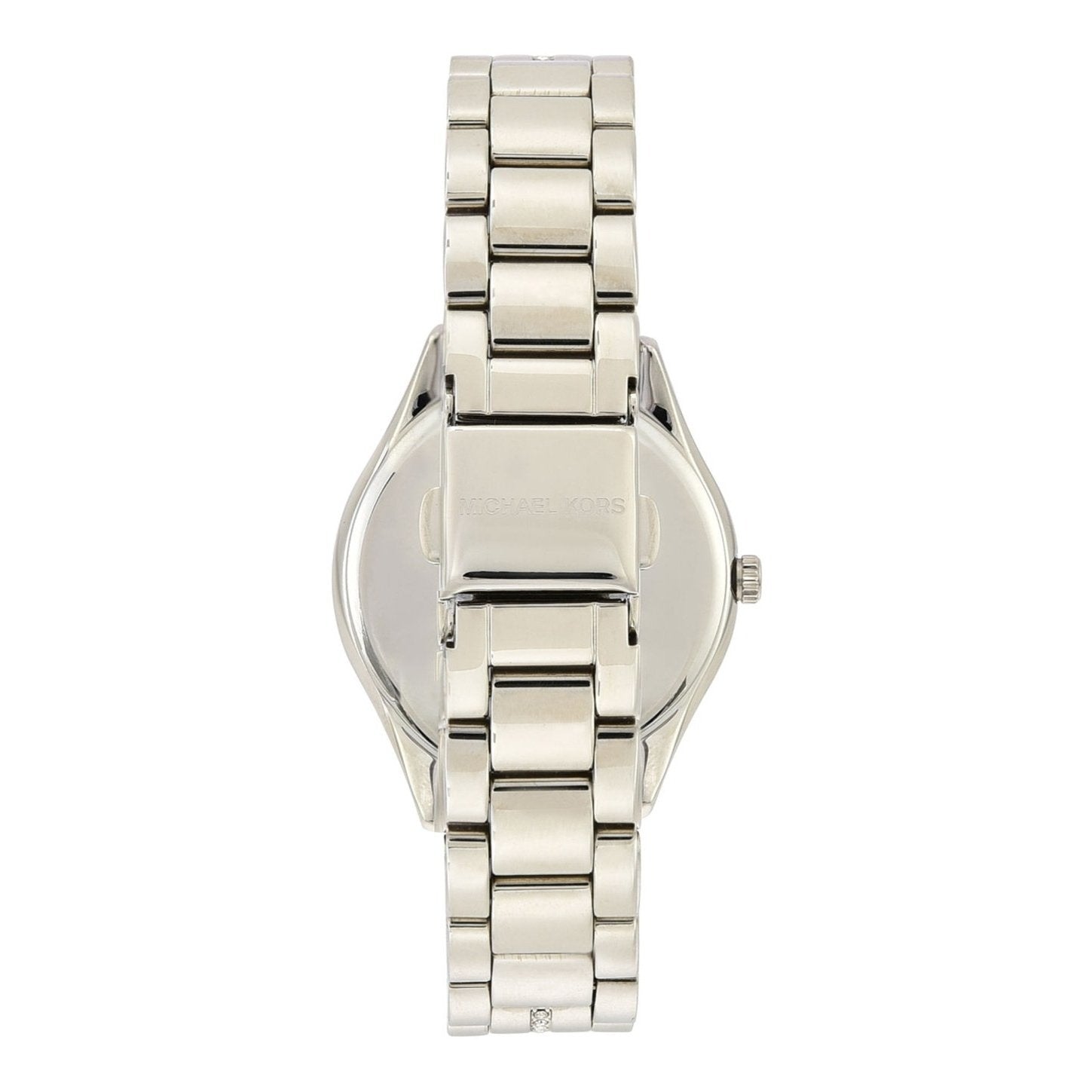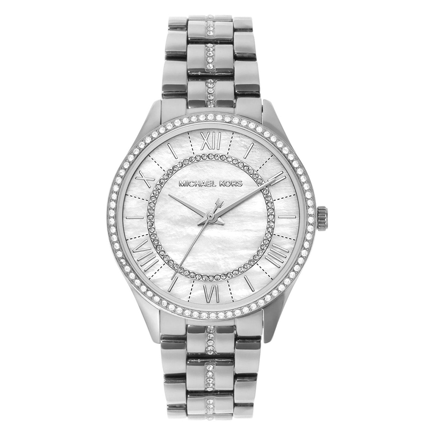 This Michael Kors Lauryn watch features a sleek stainless-steel round case with a glitz topring, glossy white mother-of-pearl dial and a polished stainless-steel three-link bracelet with pave detailing on the Centrelink. This collection of models, all fitted with self-winding calibres, is at the same time totally contemporary and perfectly timeless.