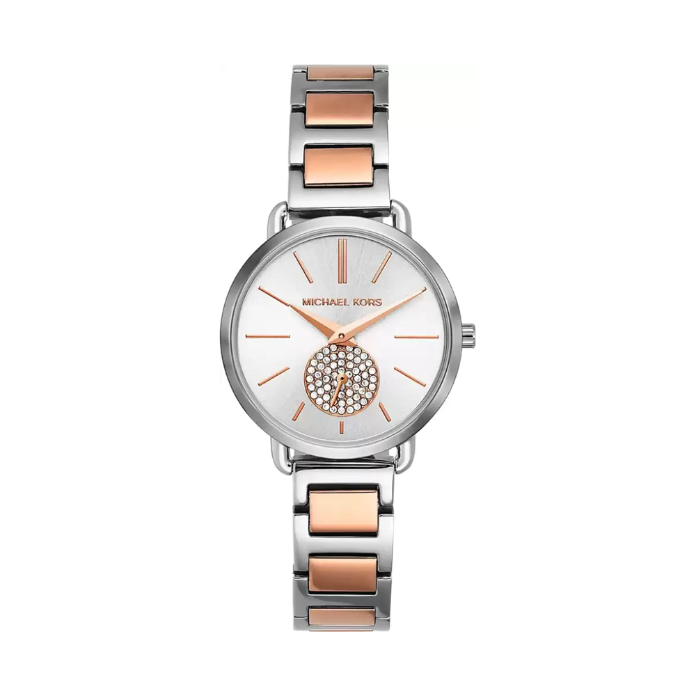 The Michael Kors Portia watch is the face of sleek, modern chic. A stainless steel case and minimalist sunray dial with stick indexes and sixty-second sub-dial shines against a stylish strap. Michael Kors watches lend your rotation a fresh vibe whether you're at the office or out on the town....