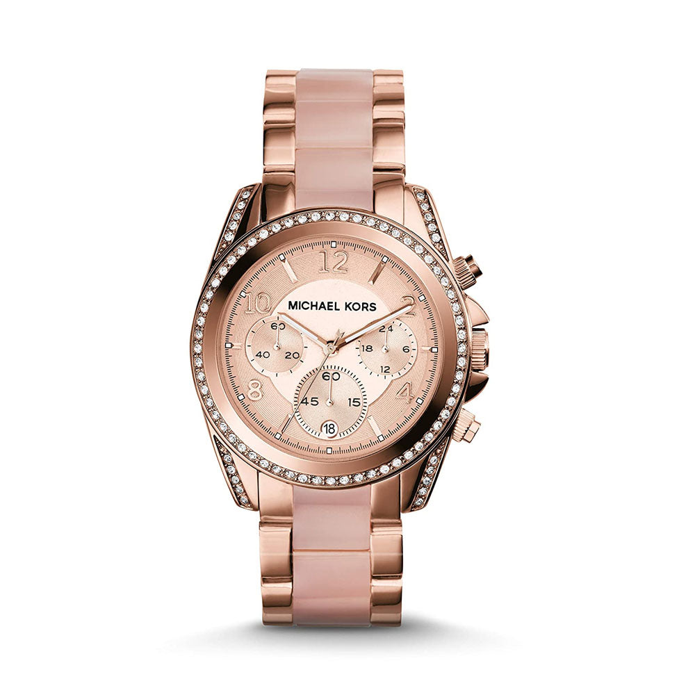 Michael Kors Women's Blair Stainless steel caseback, Stainless steel bracelet with acetate center links bracelet, Rose gold dial, Quartz movement, Scratch resistant mineral, Water resistant up to 10 ATM - 100 meters - 330 feet.