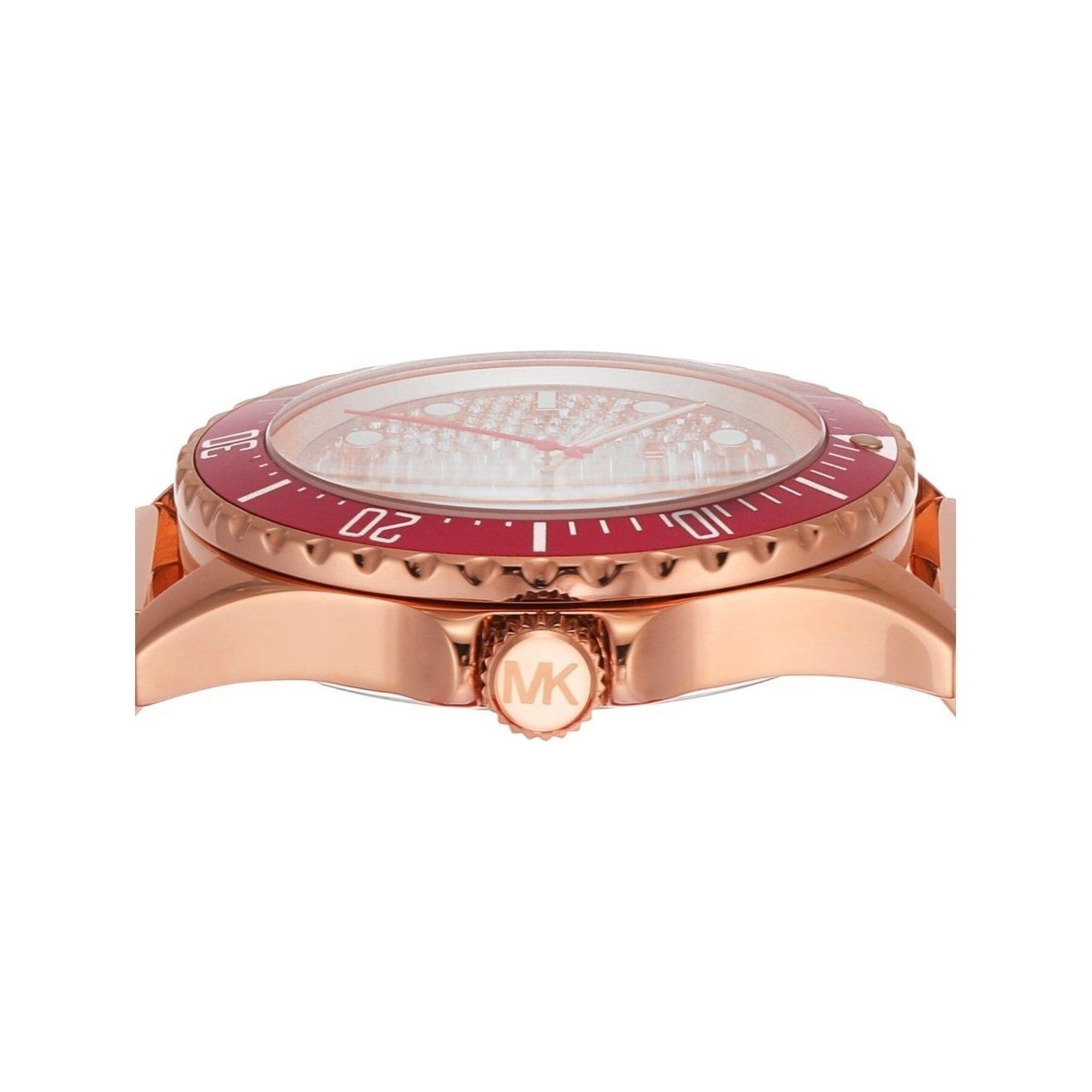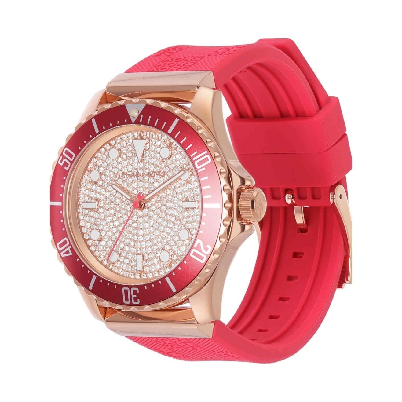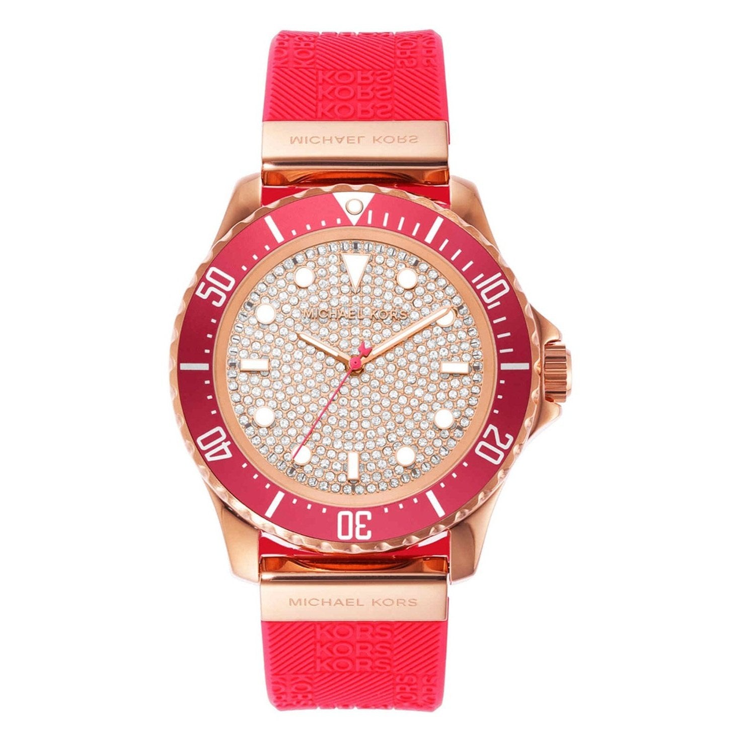Add a tinge of subtlety to your look with this women's analog watch from Michael Kors. The rose gold round dial is protected by a mineral glass. Michael Kors' 43mm Everest watch features a rose gold pave dial, three-hand and geranium pink silicone strap.