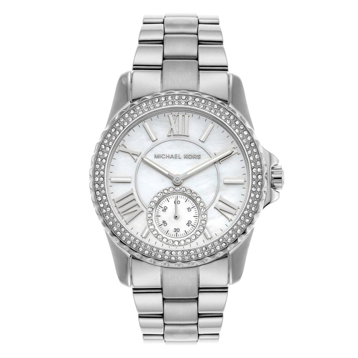 A must-have timepiece for all the watch aficionados, this women's analog watch from Michael Kors will be a perfect pick. The mother of pearl round dial is protected by a mineral glass. It has a crown for time adjustment. The stainless steel strap comes in a silver hue that further...