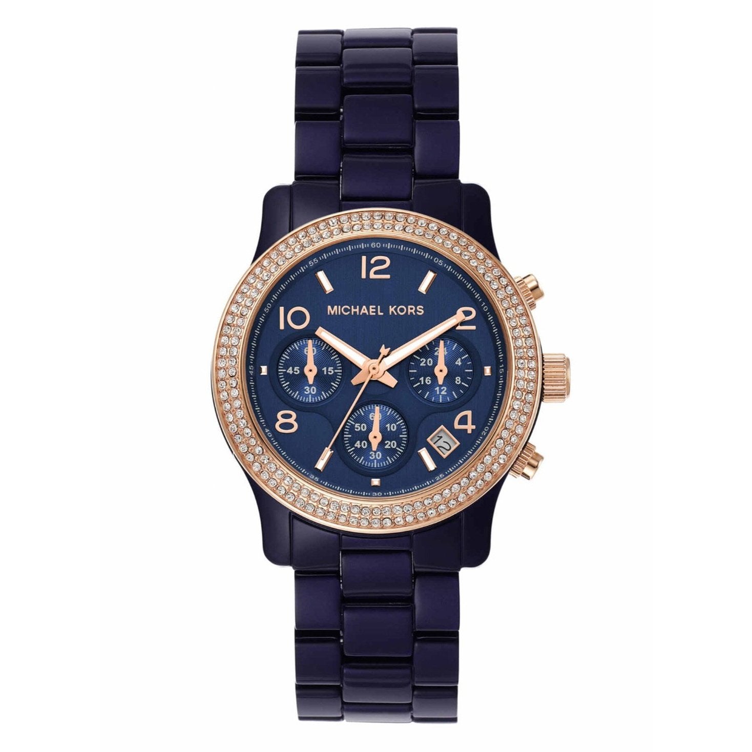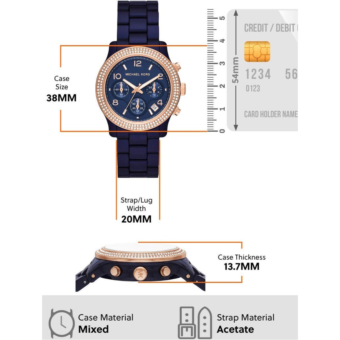 Carry great technology wrapped around your wrist with this stylish women's analog watch from Michael Kors. The blue round dial is protected by a mineral glass. It has a crown for time adjustment. The acetate strap comes in a blue hue that further elevates the look of the timekeeper. Besides,...