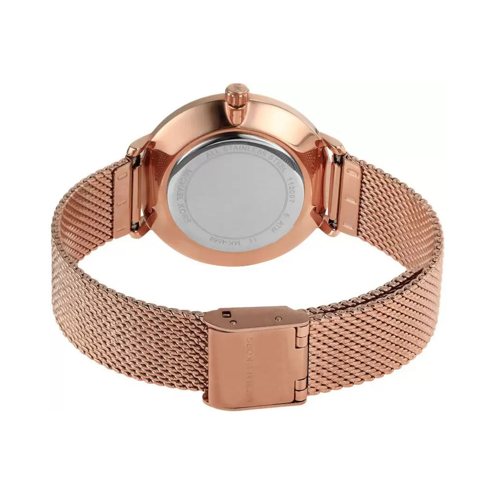 A true style statement, this voguish Rose Gold Michael Kors women’s Watch will definitely amp up your fashion quotient. Michael Kors' Pyper 32mm watch features a white mother-of-pearl dial with rose gold-tone stick indexes, rose gold-tone case with a pave topring, two-hand movement, and crystal mesh rose gold-tone stainless steel bracelet. Ace your overall look by wearing this timeless piece of accessory again and again.