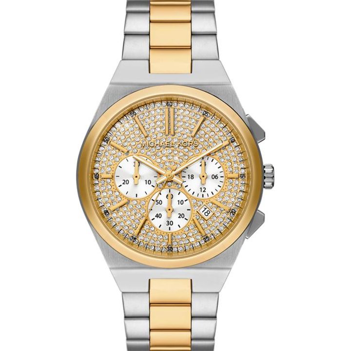 Michael Kors gift set includes a 33mm Lennox watch featuring a gold dial, three hand movement and two tone stainless steel bracelet and a 41mm Lennox watch featuring a gold dial, chronograph movement and two tone stainless steel bracelet. Amaze everyone around you by wearing this womens analog watch from the collection by Michael Kors. The gold round dial is protected by a mineral glass. It features a crown for time adjustment.