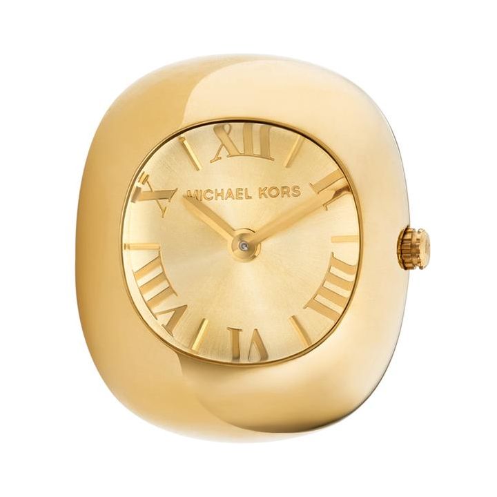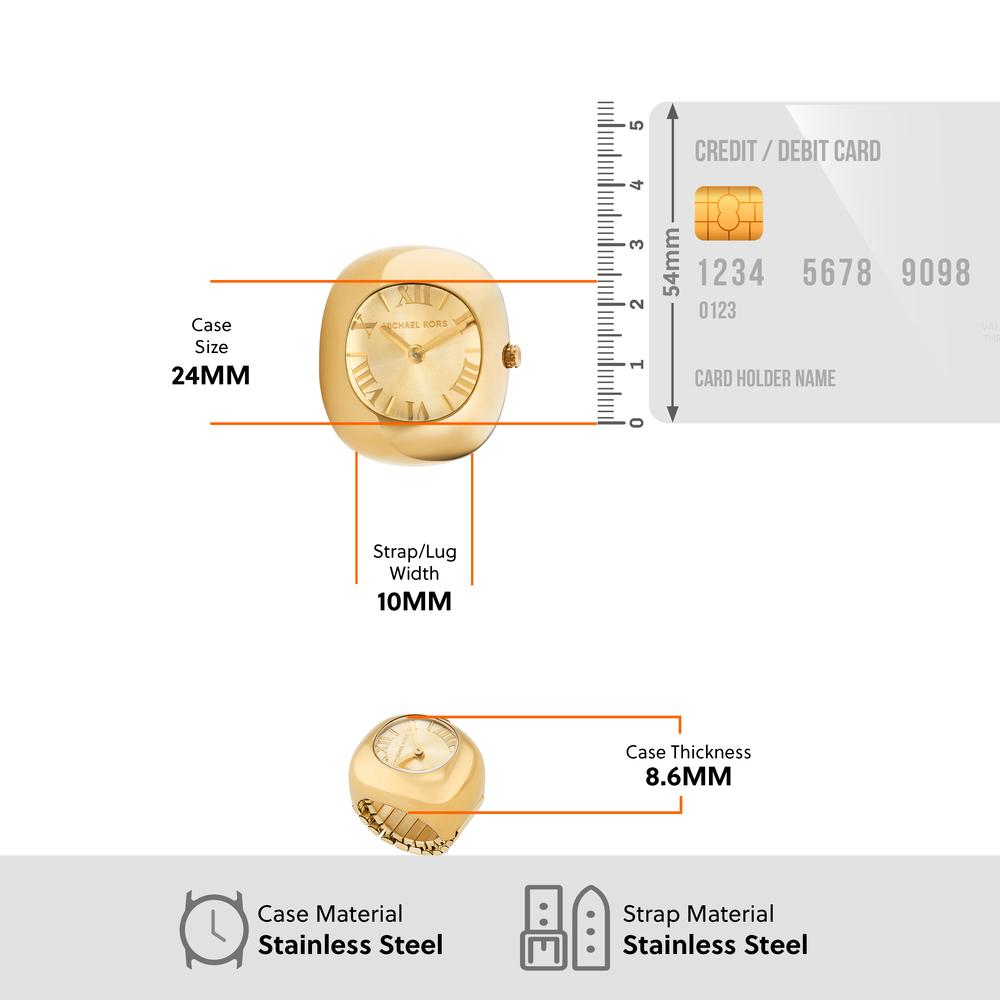 Michael Kors 24mm Rylee watch ring features a gold sunray dial, two hand movement and gold tone stainless steel band. Amaze everyone around you by wearing this womens analog watch from the collection by Michael Kors. The gold round dial is protected by a mineral glass. It features a crown...