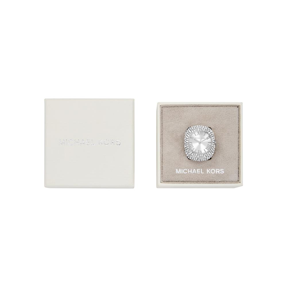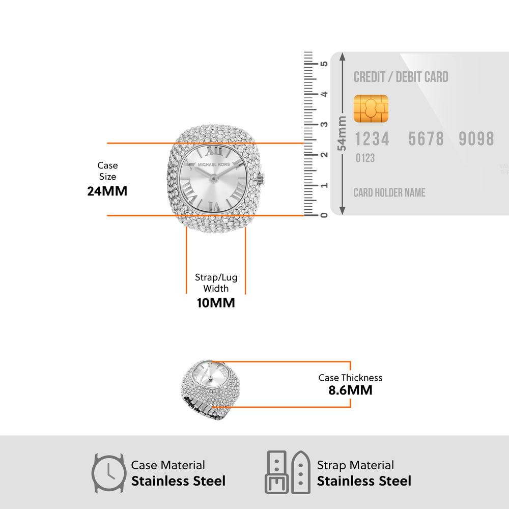 Michael Kors 24mm Rylee watch ring features a white sunray dial, all over case, two hand movement and stainless steel band. Amaze everyone around you by wearing this womens analog watch from the collection by Michael Kors. The white round dial is protected by a mineral glass. It features a...