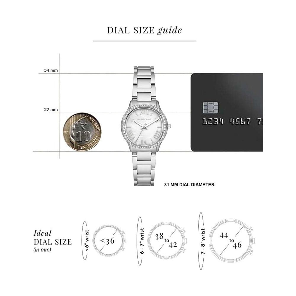 Go to the shopMichael Kors' 31mm Sage watch features a mother-of-pearl polished dial, three-hand movement and stainless steel bracelet.