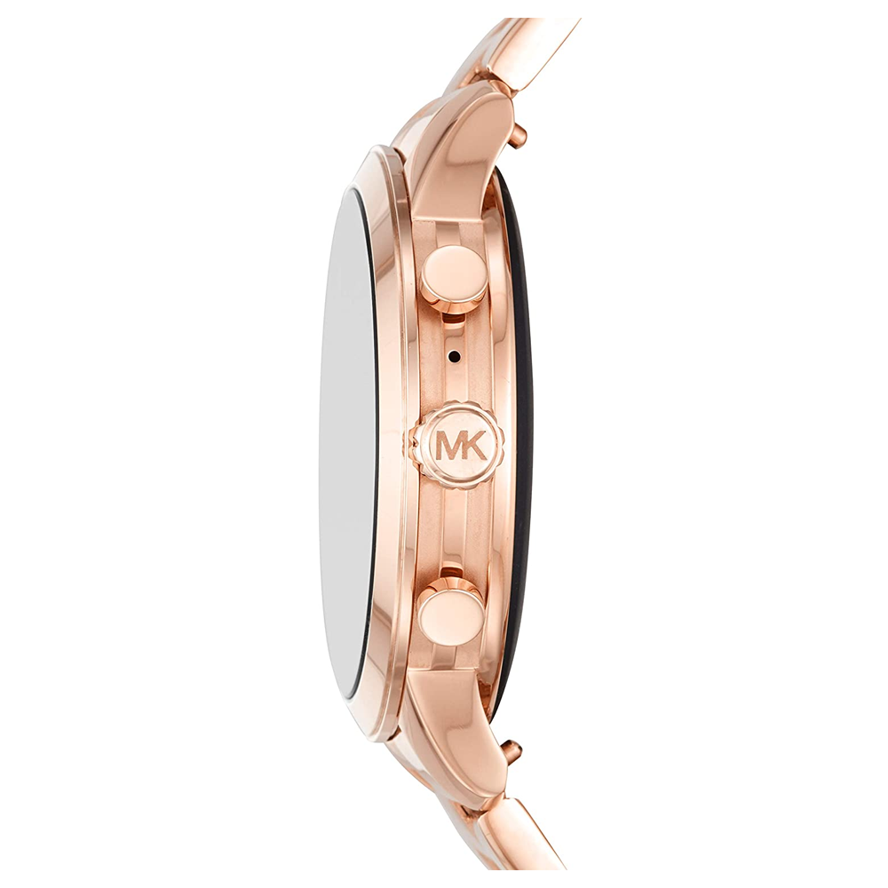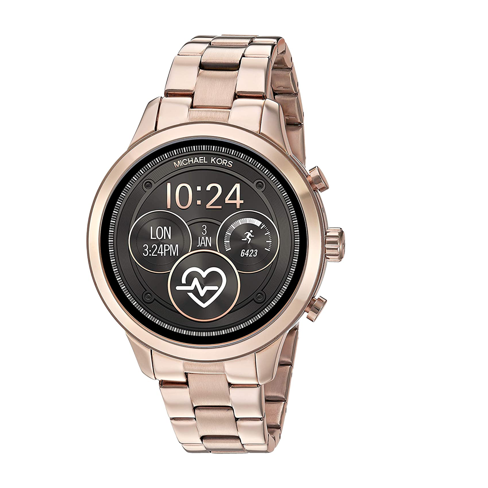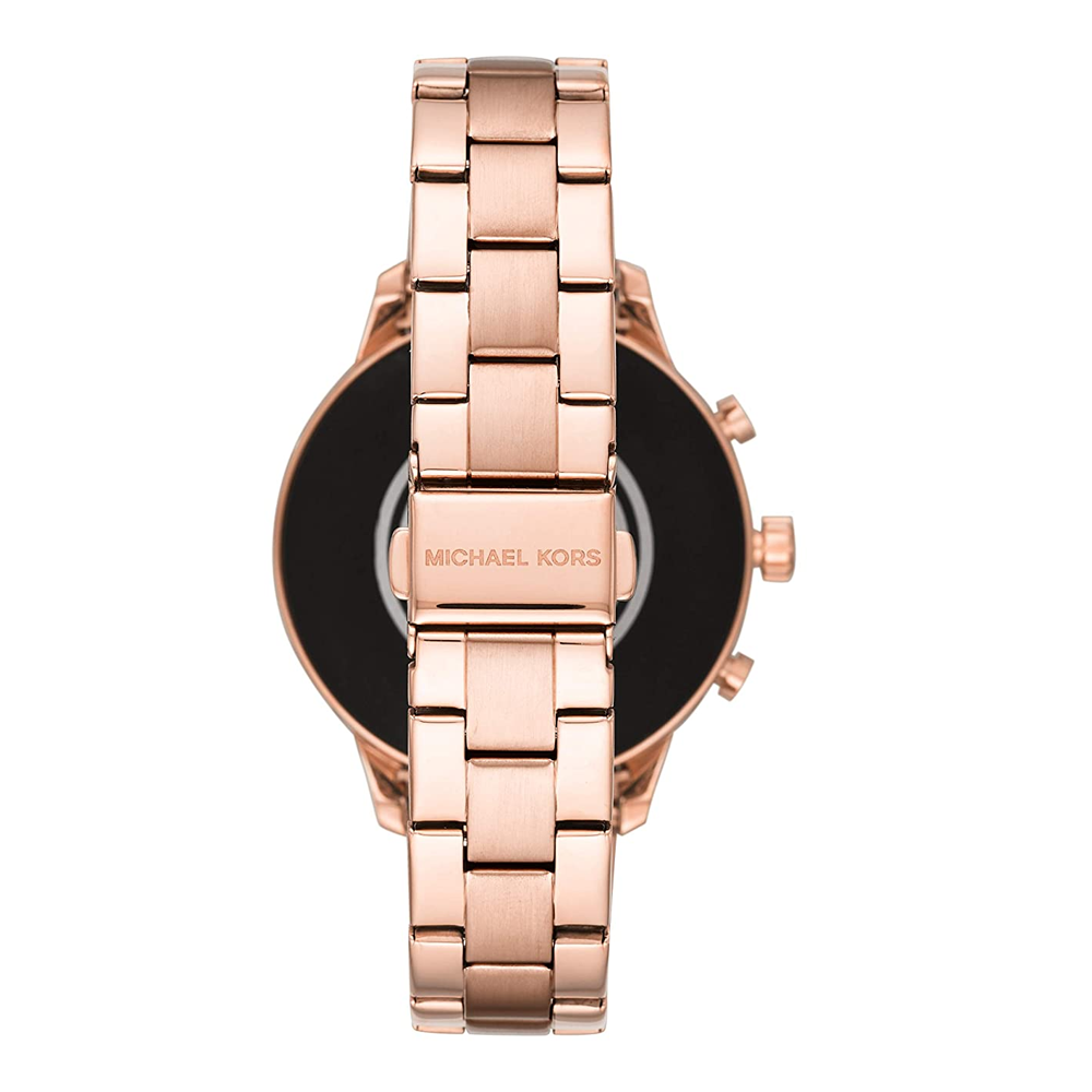 Rose gold-tone stainless steel case with a rose gold-tone stainless steel bracelet. Fixed rose gold-tone stainless steel bezel. Dial Type: digital. Perpetual calendar. Powered by Wear OS by Google quartz movement. Scratch resistant glass crystal. Pull / push crown. Solid case back. Round case shape. Case size: 41 mm. Tang clasp. Water resistant at 30 meters / 100 feet. Functions: heart rate tracking, smartphone notifications, nfc payments, gps, rapid charging, touchscreen functionality, microphone and google assistant, music storage & controls, customizable watch faces, custom goal & alarm settings, multiple time zones. Sport watch style. Michael Kors Runway Heart Rate Rose Gold-Tone Smartwatch MKT5046.
