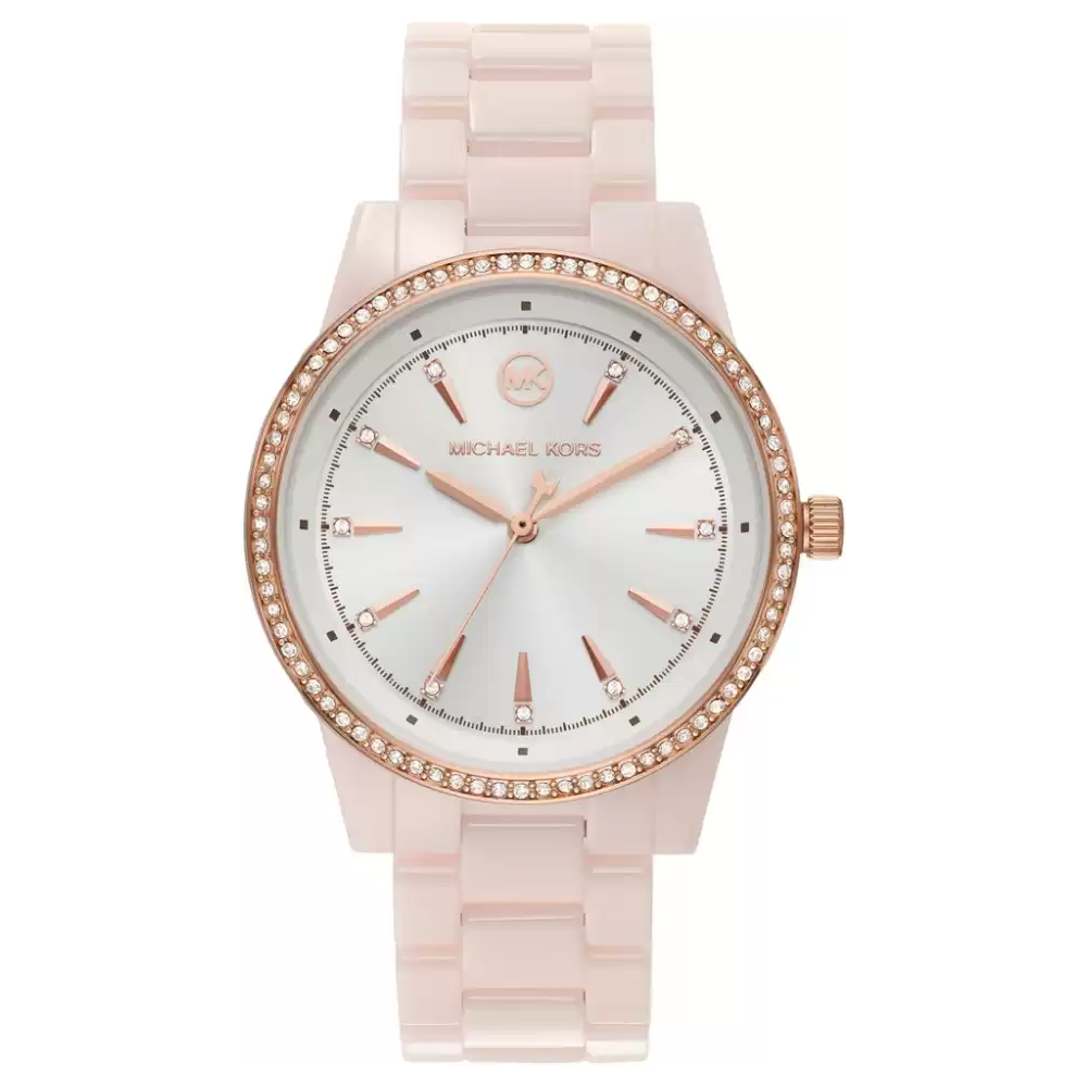 Made in USA or Imported From jet setting adventures to the 9 to 5 grind, the iconic Ritz watch collection by Michael Kors provide luxurious style with a modern splash of trend-right touches Featuring a 37mm case, 18mm band width, scratch-resistant mineral crystal glass, Quartz movement with 3-hand analog display,...