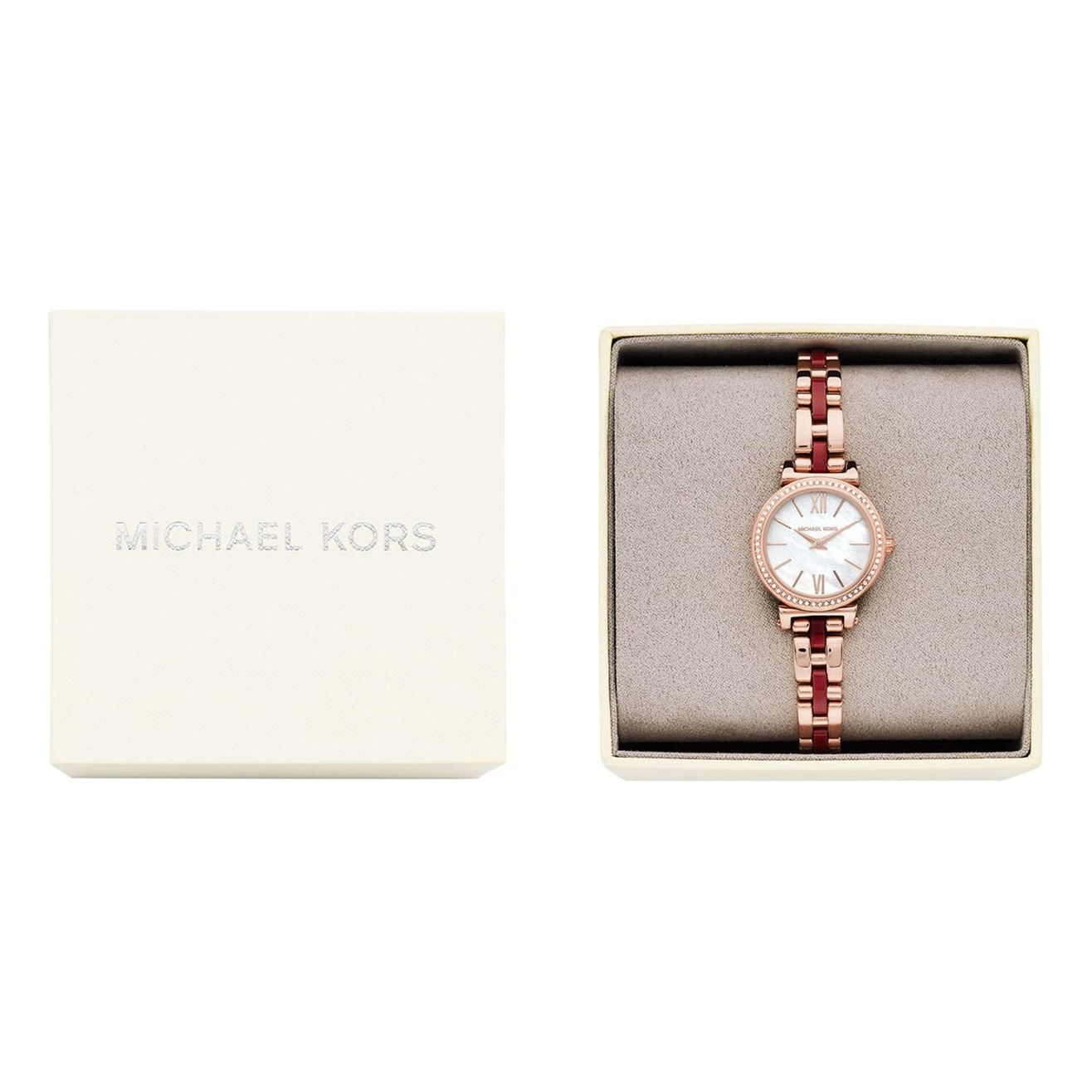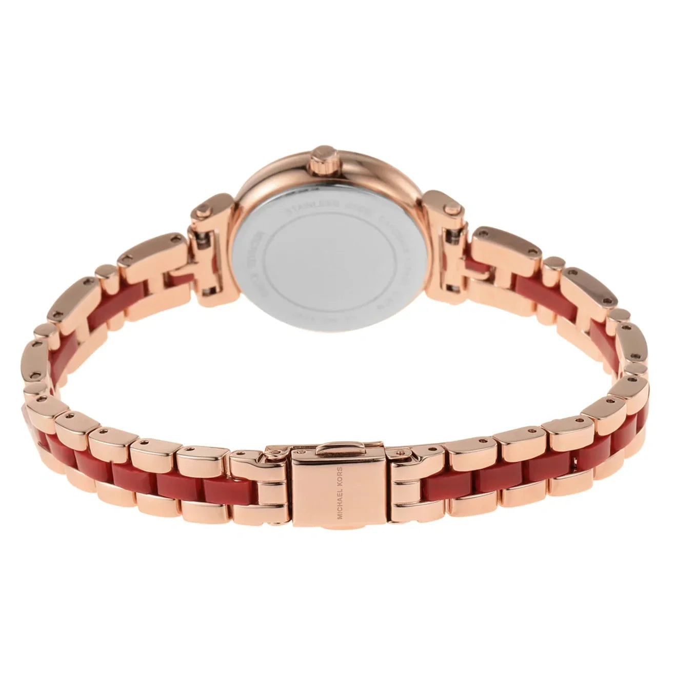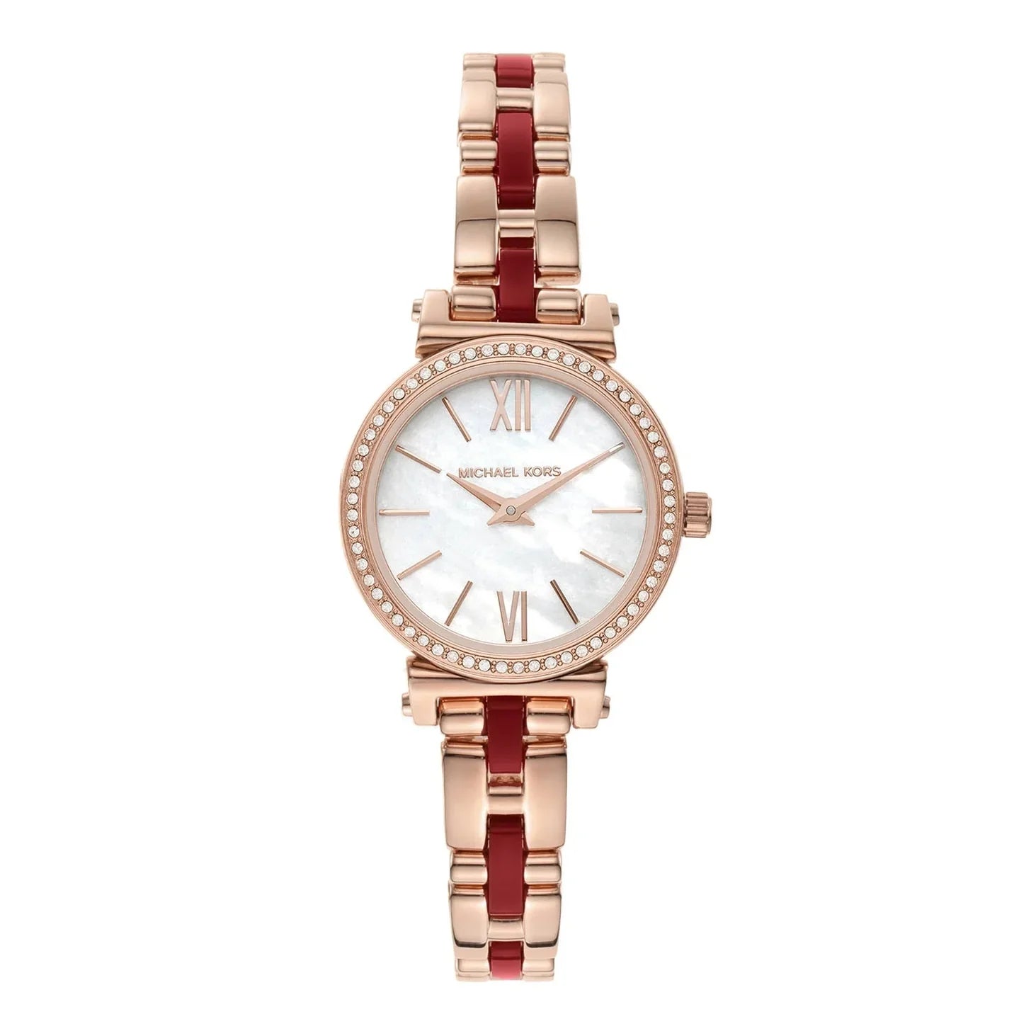 Elevate your style with the Michael Kors Women's Watch. This stunning analog timepiece features a glitzy bezel and mother-of-pearl dial, encased in a sleek case. The sophisticated design is completed with a stainless steel bracelet and red acetate center links. Enhance any outfit with this elegant and functional accessory.