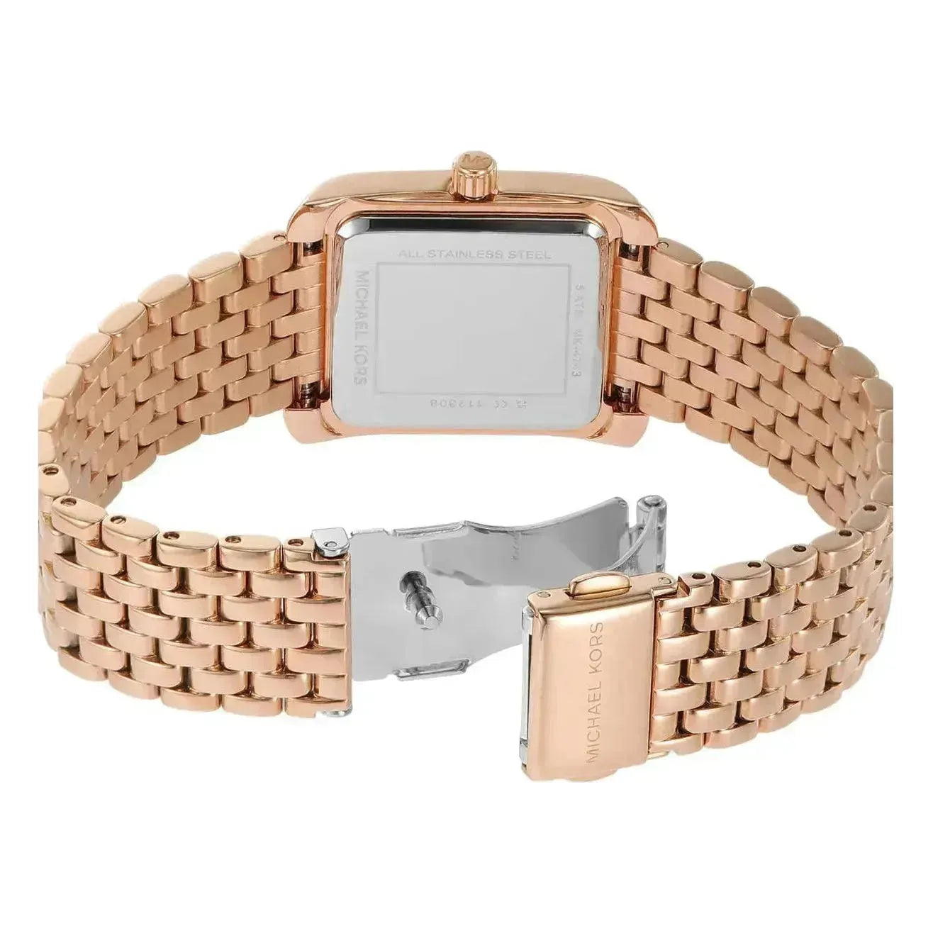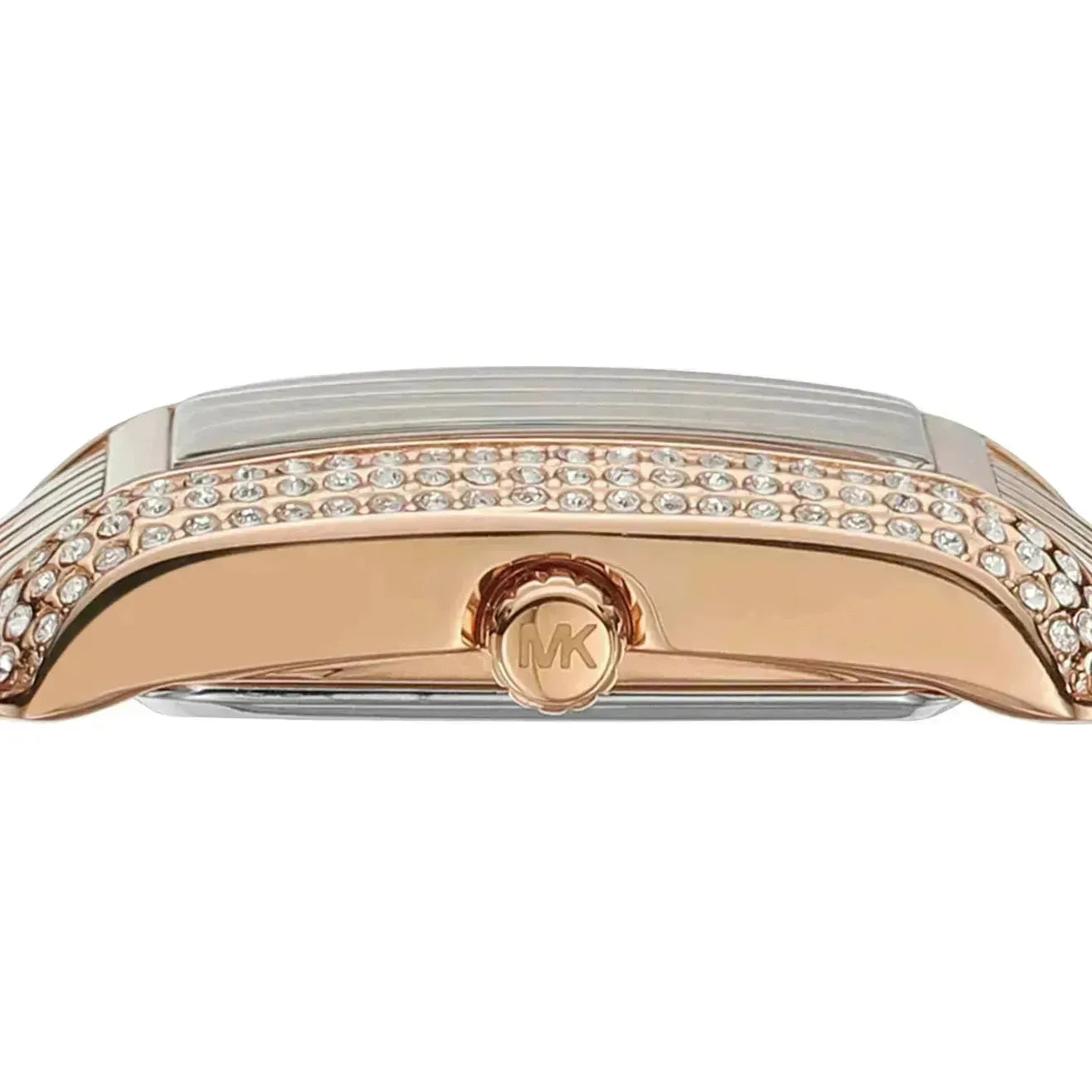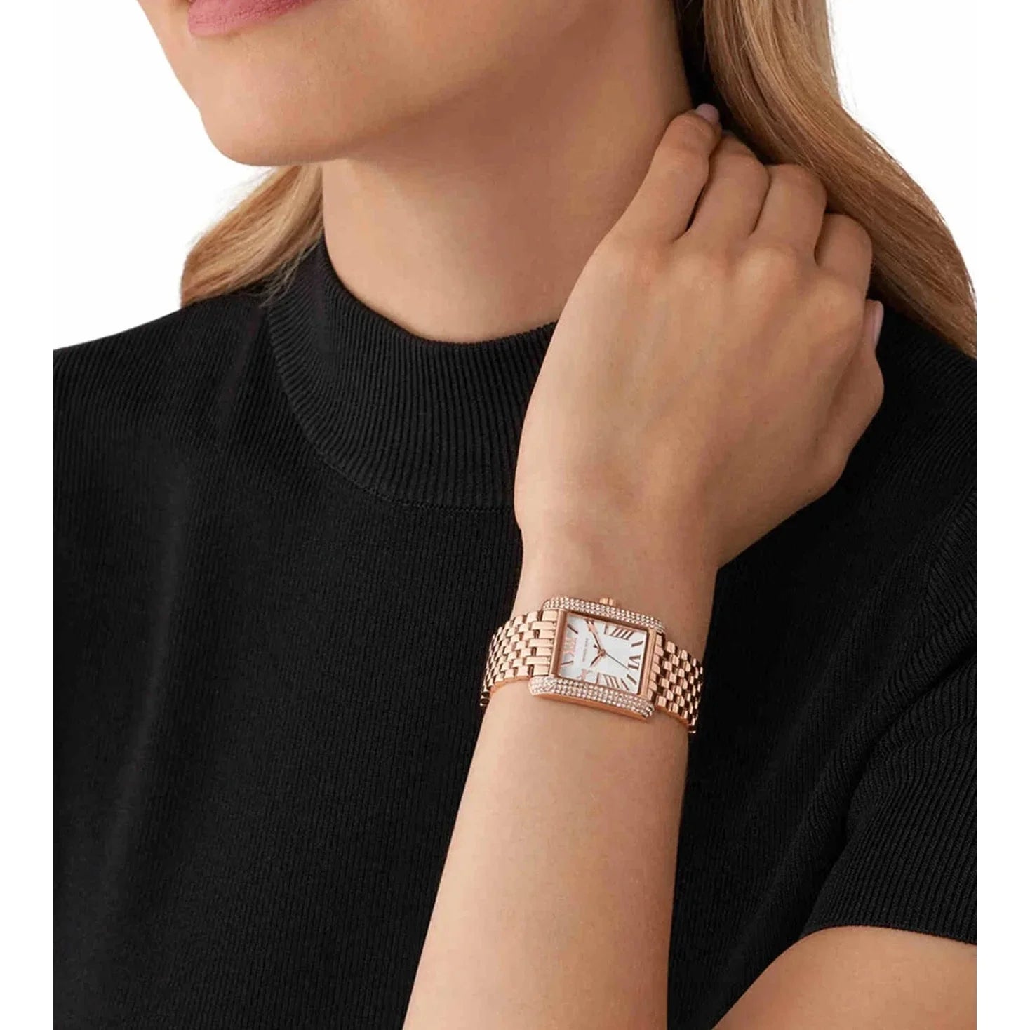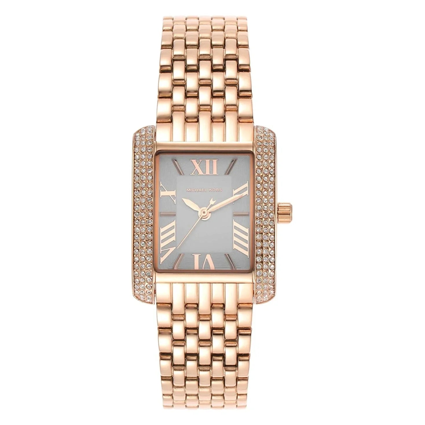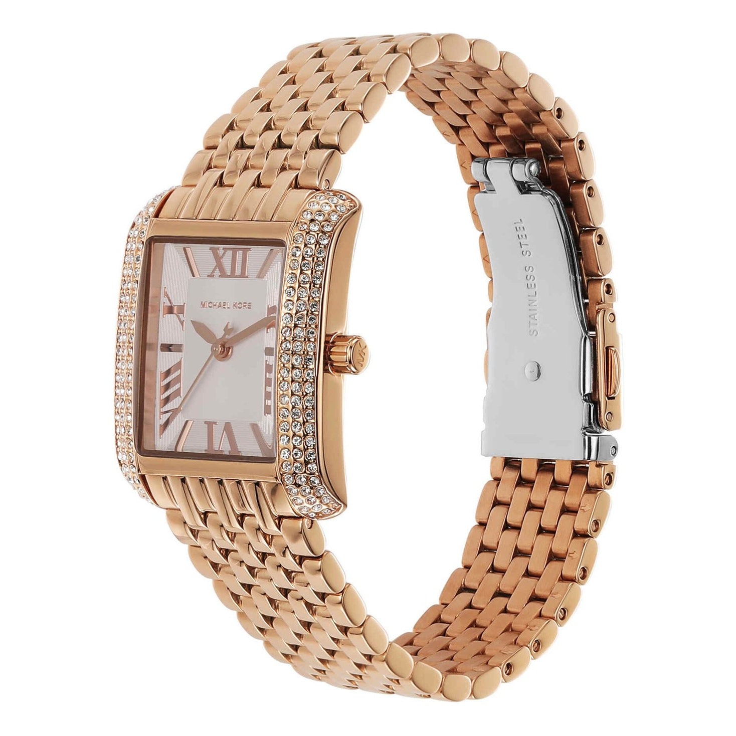 Stay stylish and on time with the Michael Kors Women's Watch. The 33mm Emery features a white rectangular dial, protected by mineral glass, and a three-hand movement for accurate timekeeping. The rose gold stainless steel strap adds a touch of elegance to this modern timepiece. Upgrade your watch collection with...