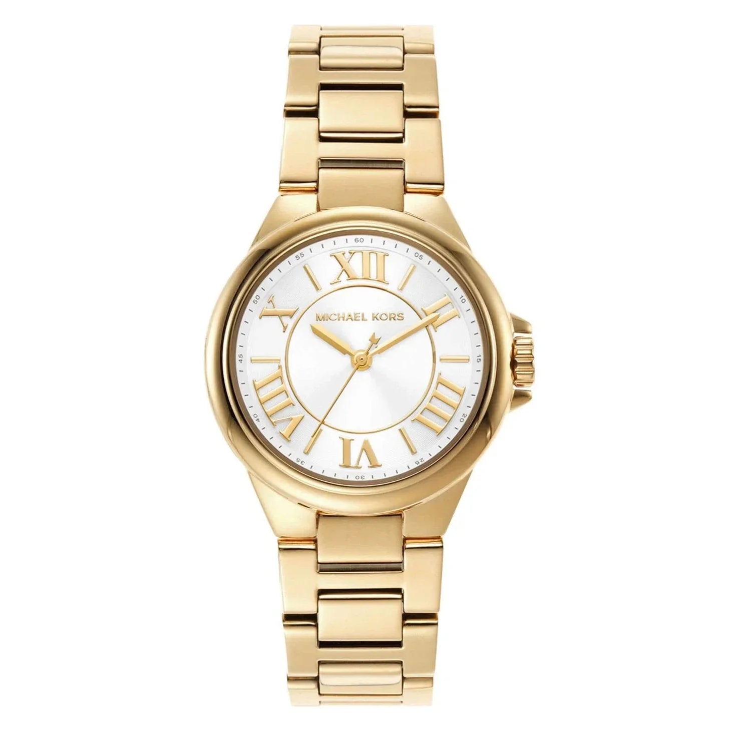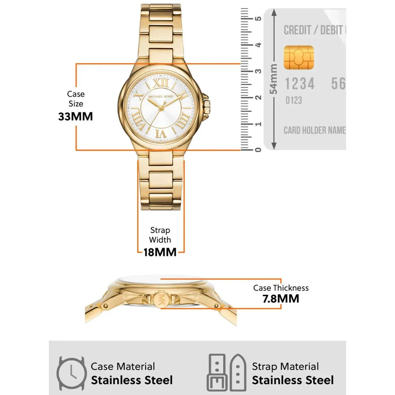 Upgrade your style with this elegant Michael Kors Women's Watch. Enjoy a comfortable fit with a 33mm case and sleek white dial. The mineral glass ensures durability while the Roman Numeral indexes add a classic touch. Complete with a safety clasp, this watch is the perfect blend of style and security.