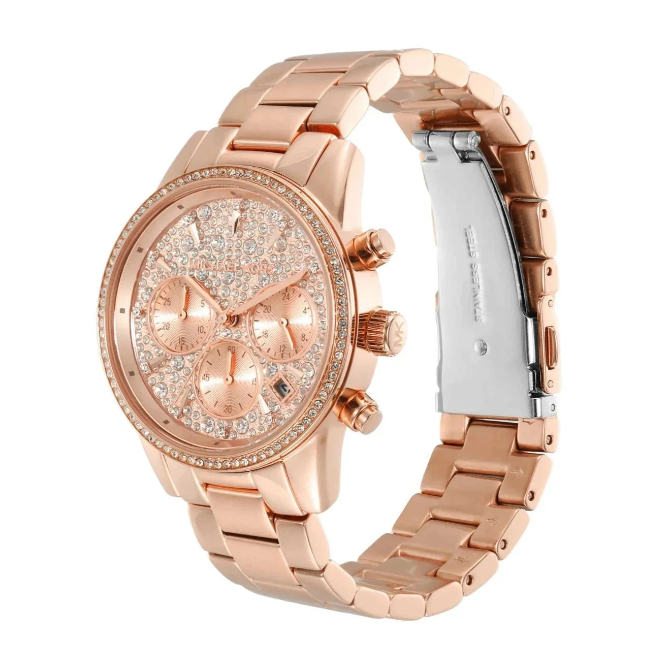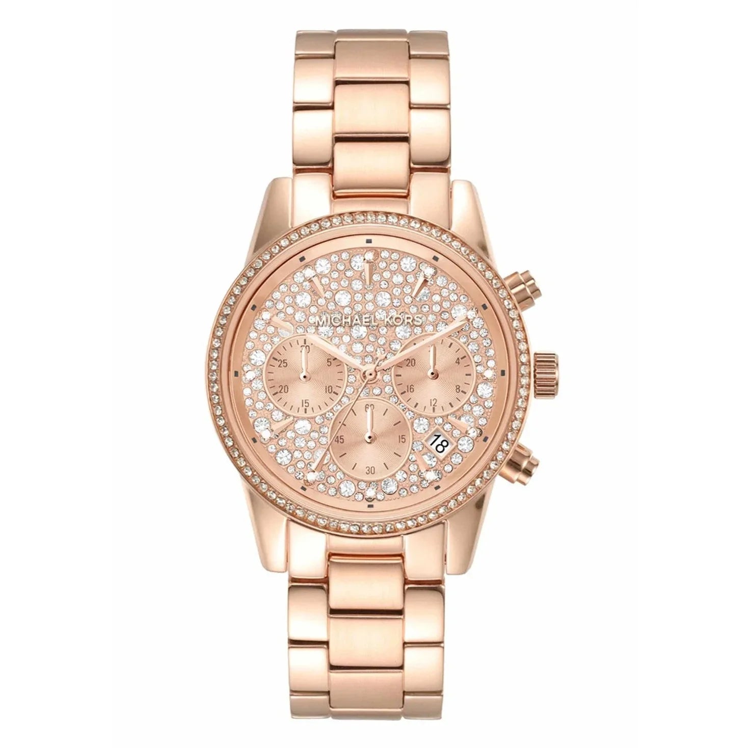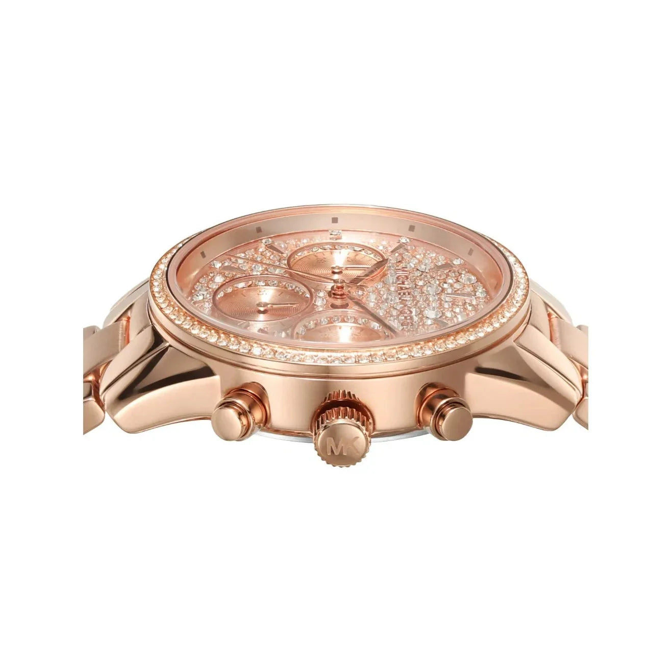 Elevate your style with the Michael Kors Women's Watch. Featuring a sleek rose gold design and protected by mineral glass, this 37mm Bryant watch boasts a stunning stingray pave dial. The chronograph movement and glitz details add a touch of luxury, while the fold-over clasp ensures a secure fit. Look...