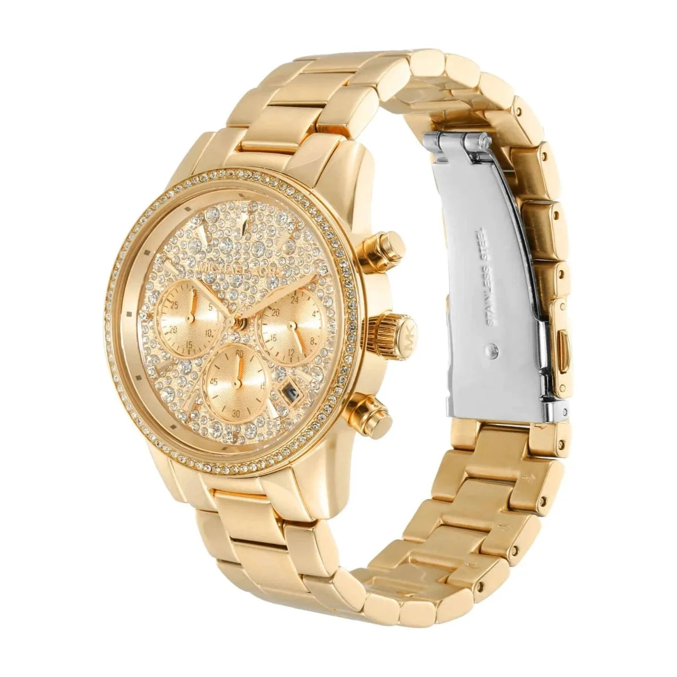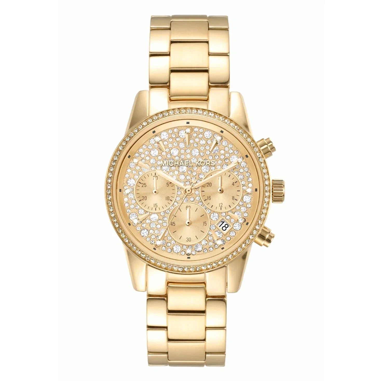 Elevate your style with Michael Kors Women's Watch. Its gold round dial and mineral glass create a timeless look, while the stingray pave dial adds a modern touch. With chronograph movement and glitzy detailing, this 37mm Bryant watch is both functional and fashionable. Plus, the fold-over push button clasp ensures a secure fit.