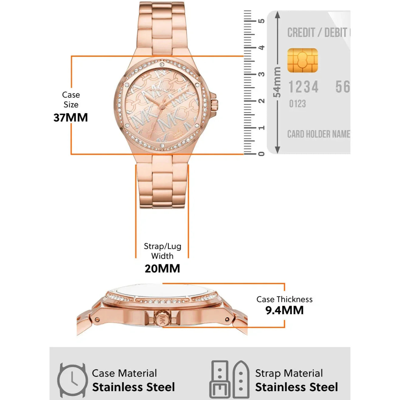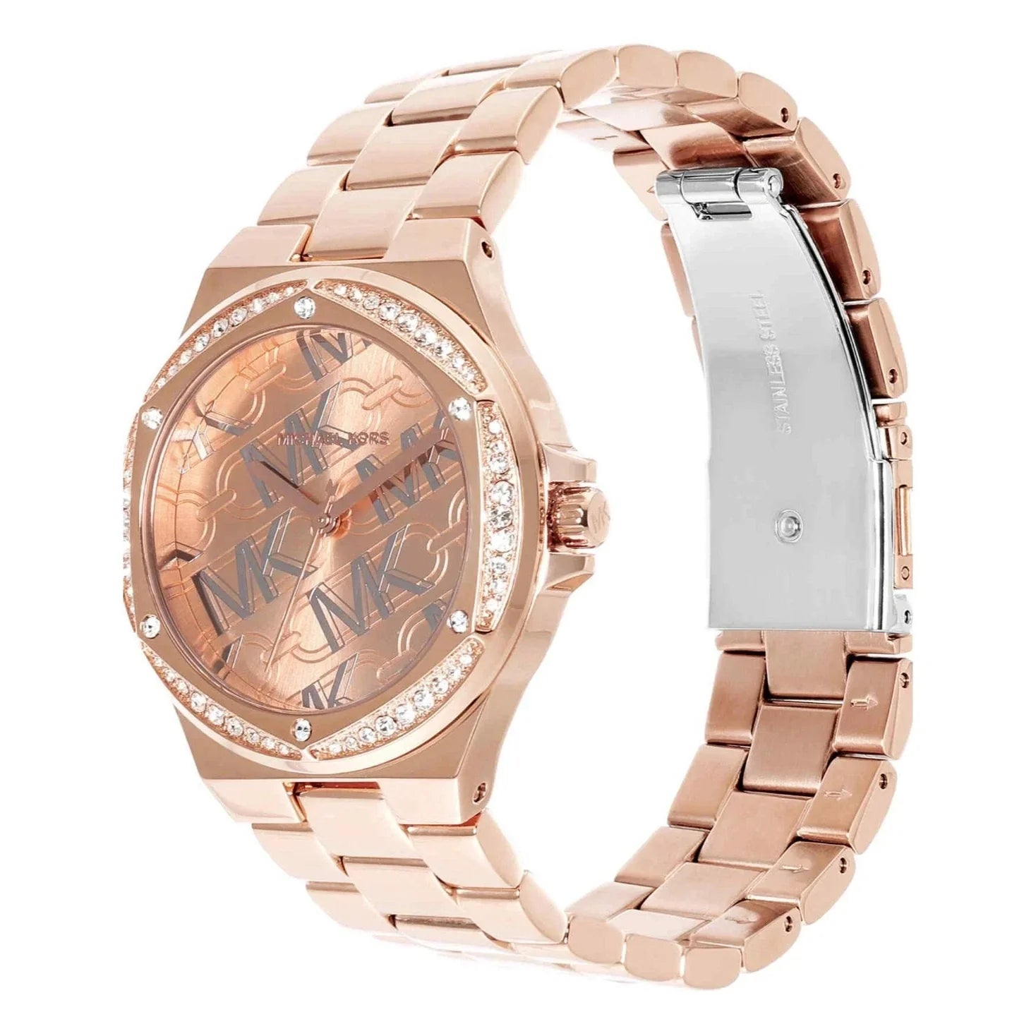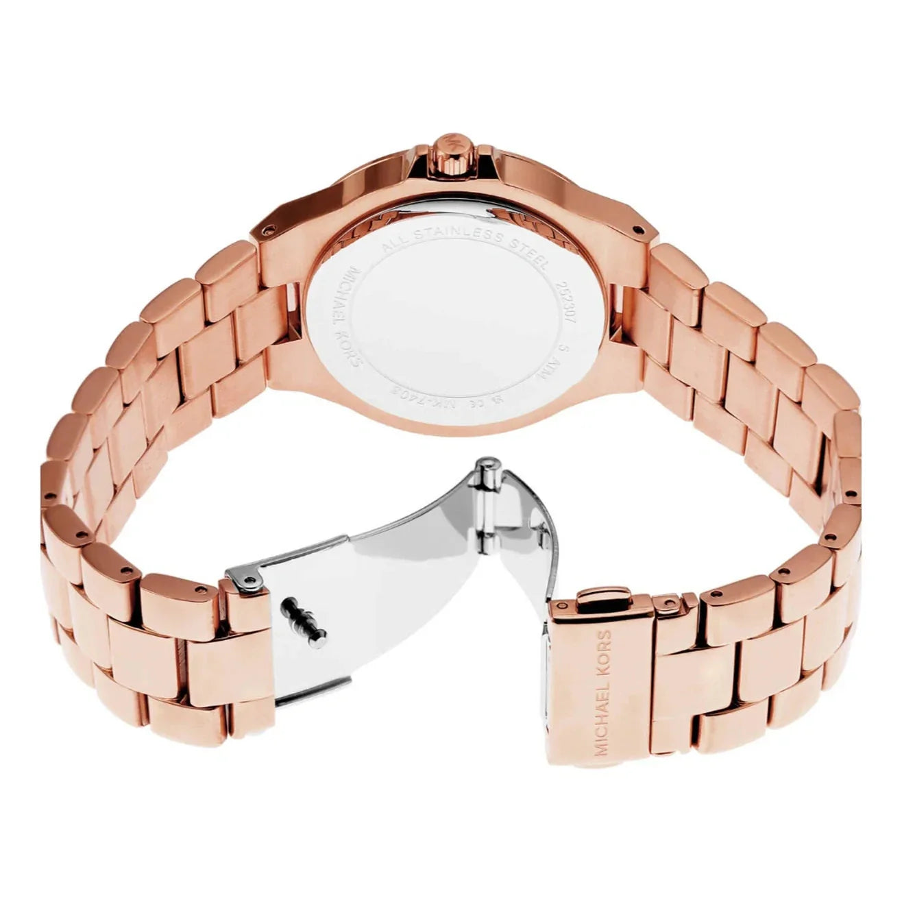 Elevate your look with Michael Kors Women's Watch. The rose gold round dial, protected by mineral glass, adds a stylish dimension. Featuring a stainless steel strap and double locking fold-over clasp, it ensures a secure fit. Perfect for all occasions.