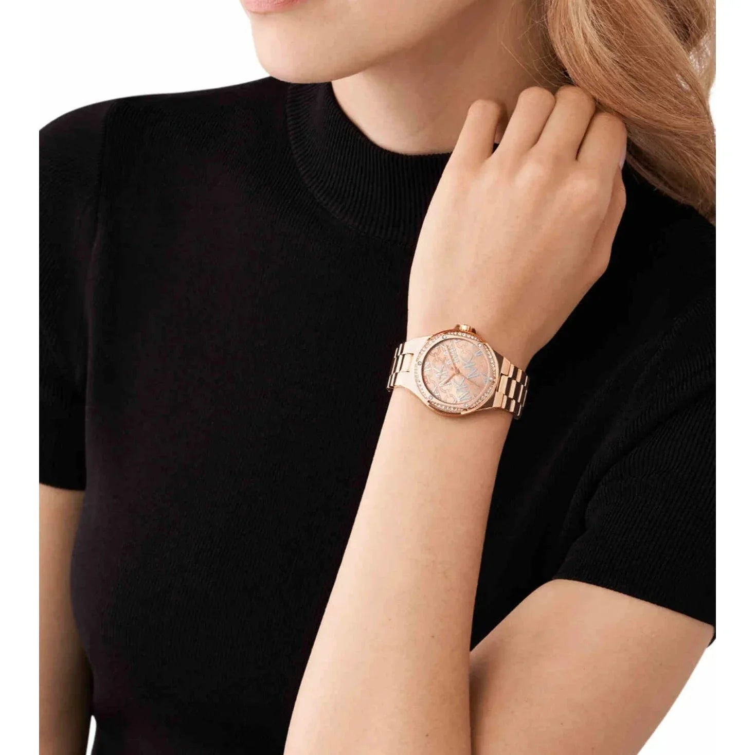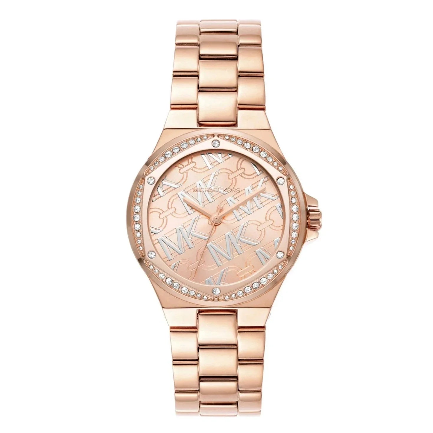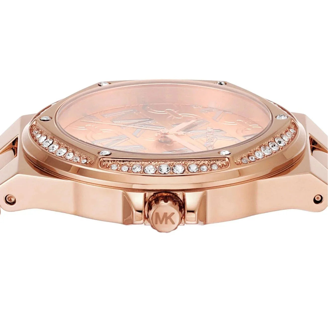 Elevate your look with Michael Kors Women's Watch. The rose gold round dial, protected by mineral glass, adds a stylish dimension. Featuring a stainless steel strap and double locking fold-over clasp, it ensures a secure fit. Perfect for all occasions.