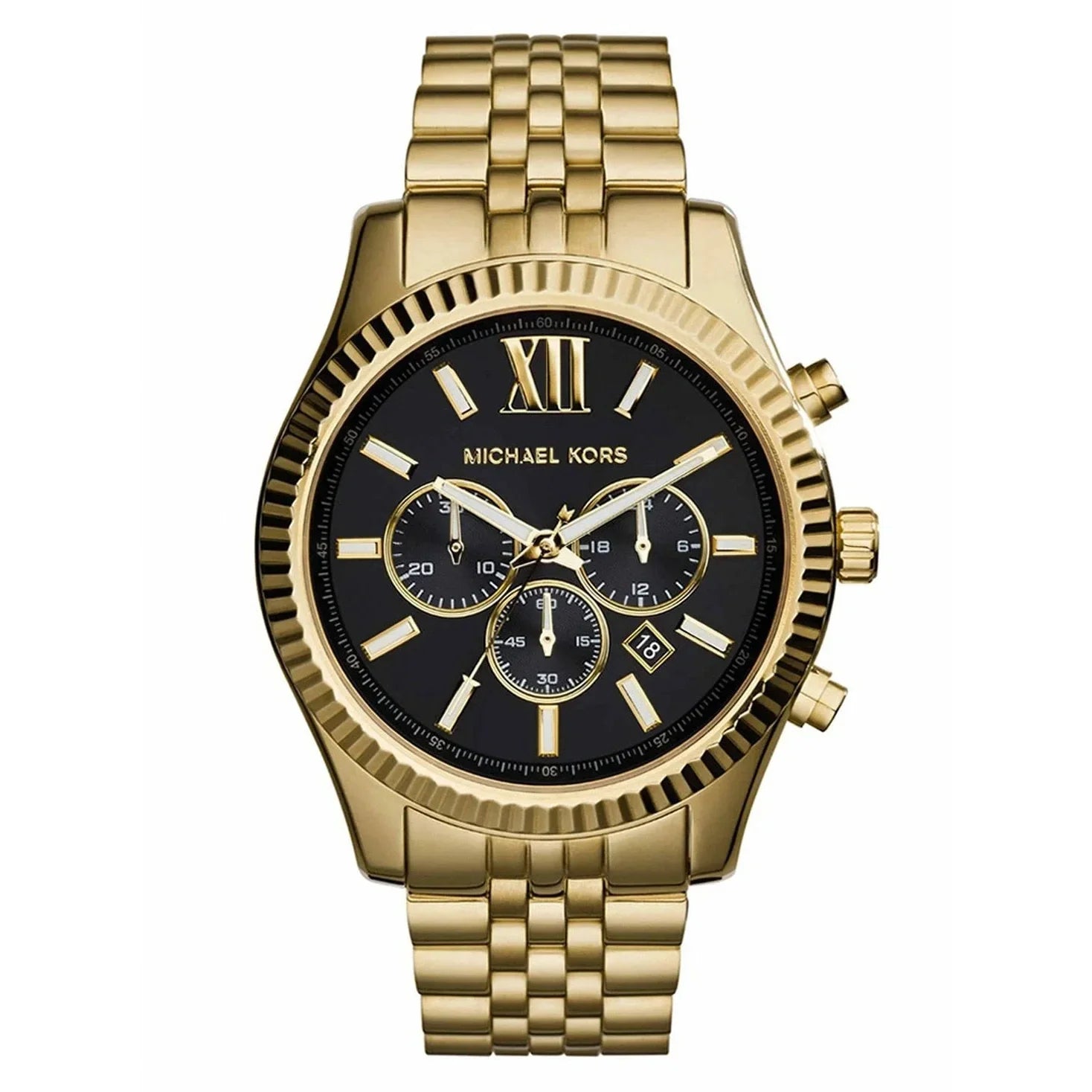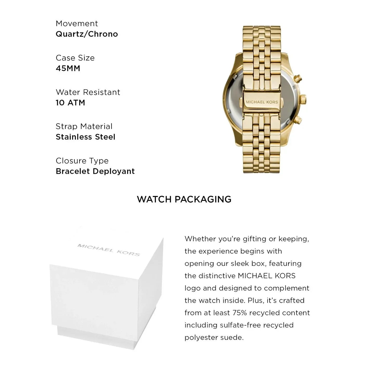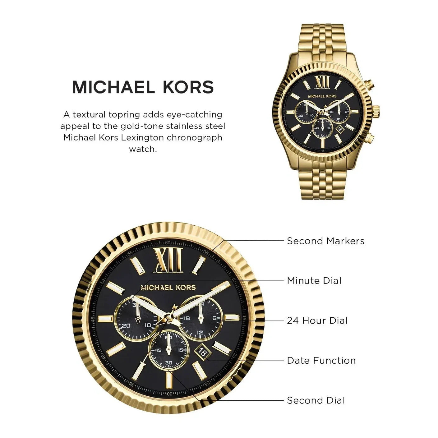 Elevate your style with the Michael Kors Men's Watch. This analog timepiece features a gold-tone stainless steel design and a textured topring for a modern and eye-catching look. The black dial with Roman numeral indices adds dimension and sophistication to this chronograph watch. Make a statement with this elevated take...