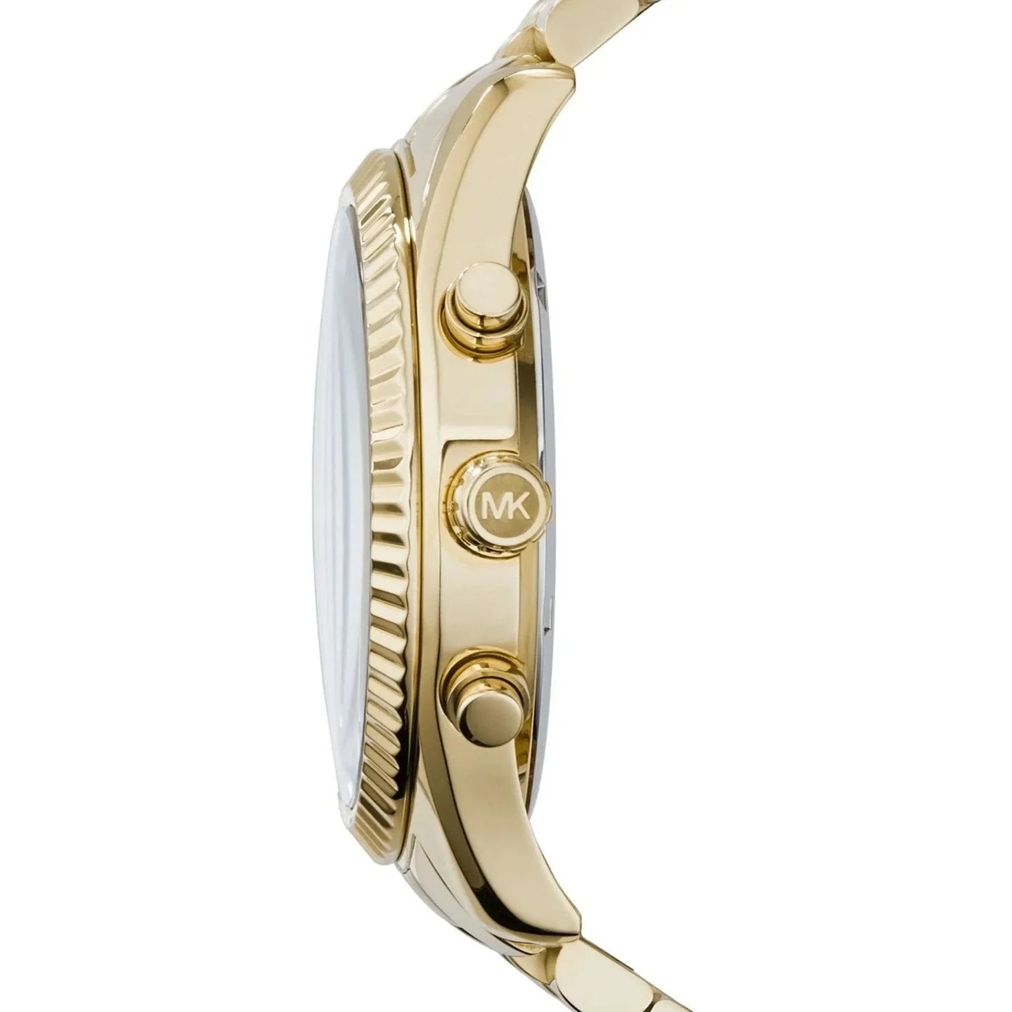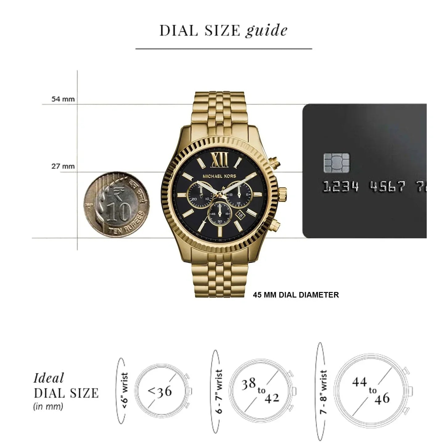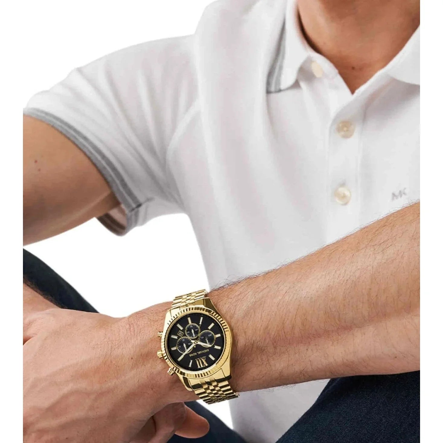 Elevate your style with the Michael Kors Men's Watch. This analog timepiece features a gold-tone stainless steel design and a textured topring for a modern and eye-catching look. The black dial with Roman numeral indices adds dimension and sophistication to this chronograph watch. Make a statement with this elevated take...