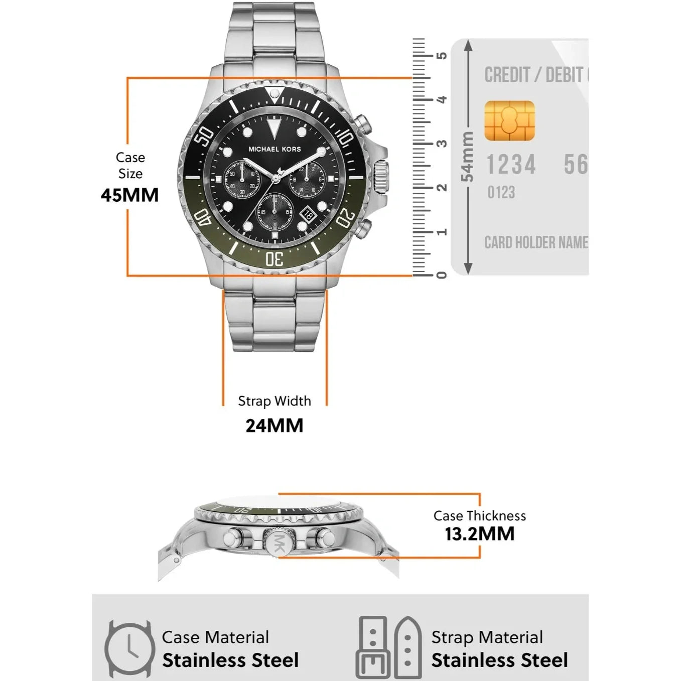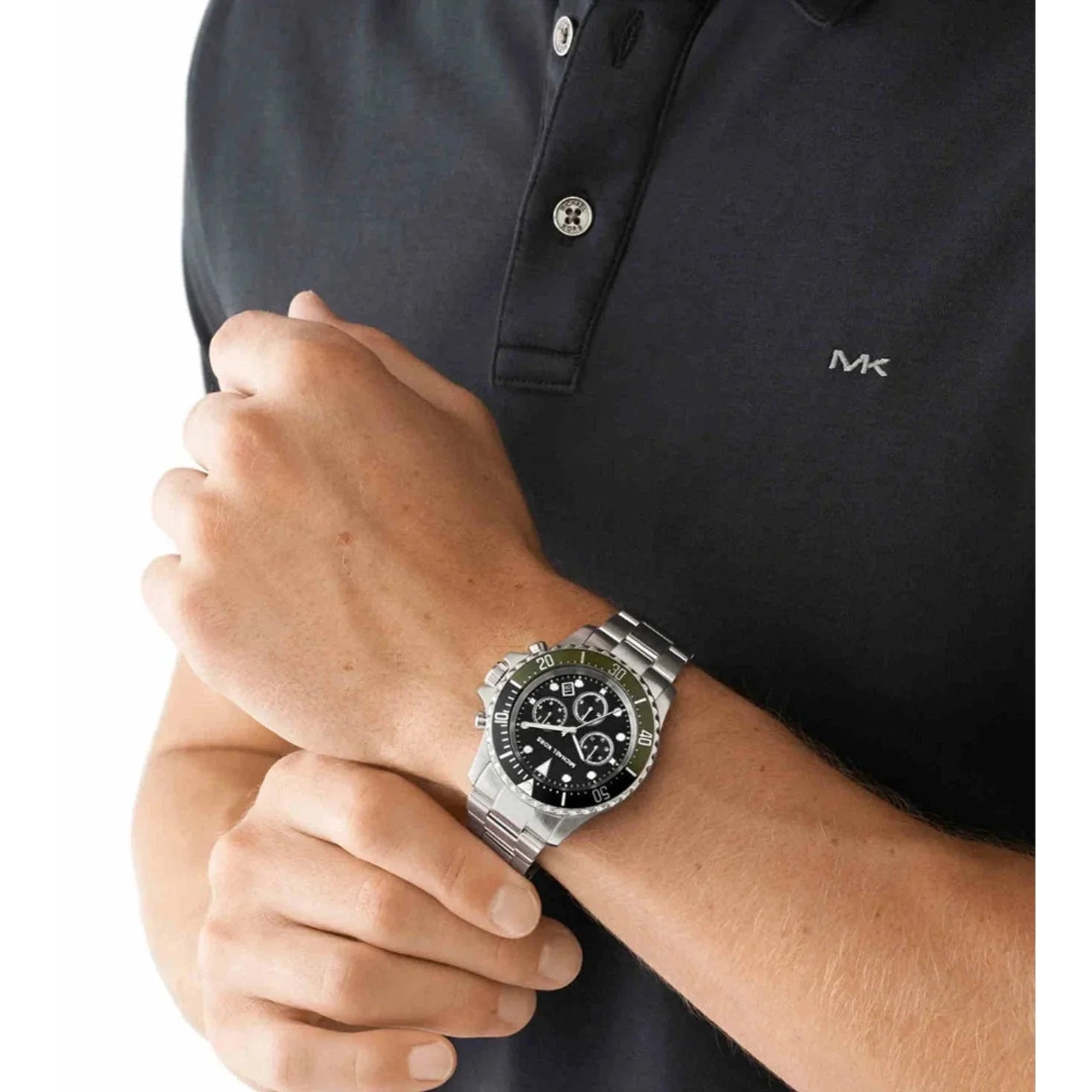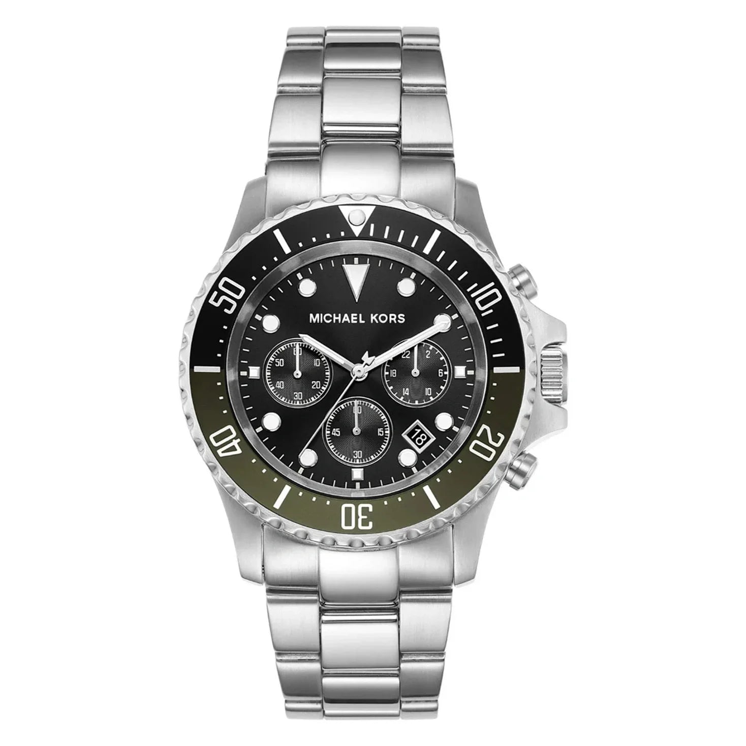 Introducing the stylish and durable Michael Kors Men's Watch. With a black round dial, mineral glass protection, and a sporty split black and olive topring, this 45mm chronograph stainless steel watch is perfect for urban men. Its fold-over push button clasp with safety clasp ensures a secure fit on the wrist.