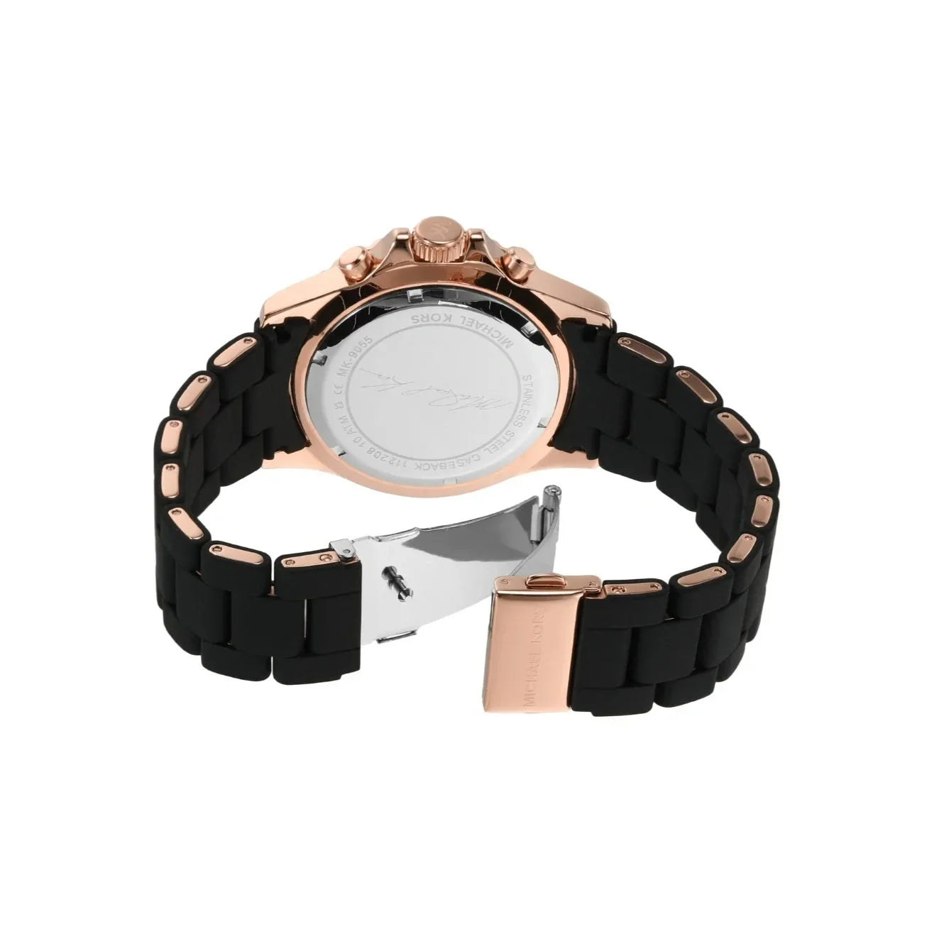 Expertly designed to complement the urban man's taste, the Michael Kors Men's Watch is a statement piece. The sleek black round dial is shielded by mineral glass. Featuring a 45mm Everest watch with a black sunray dial, chronograph movement, and black stainless steel band, it also boasts a fold-over push...