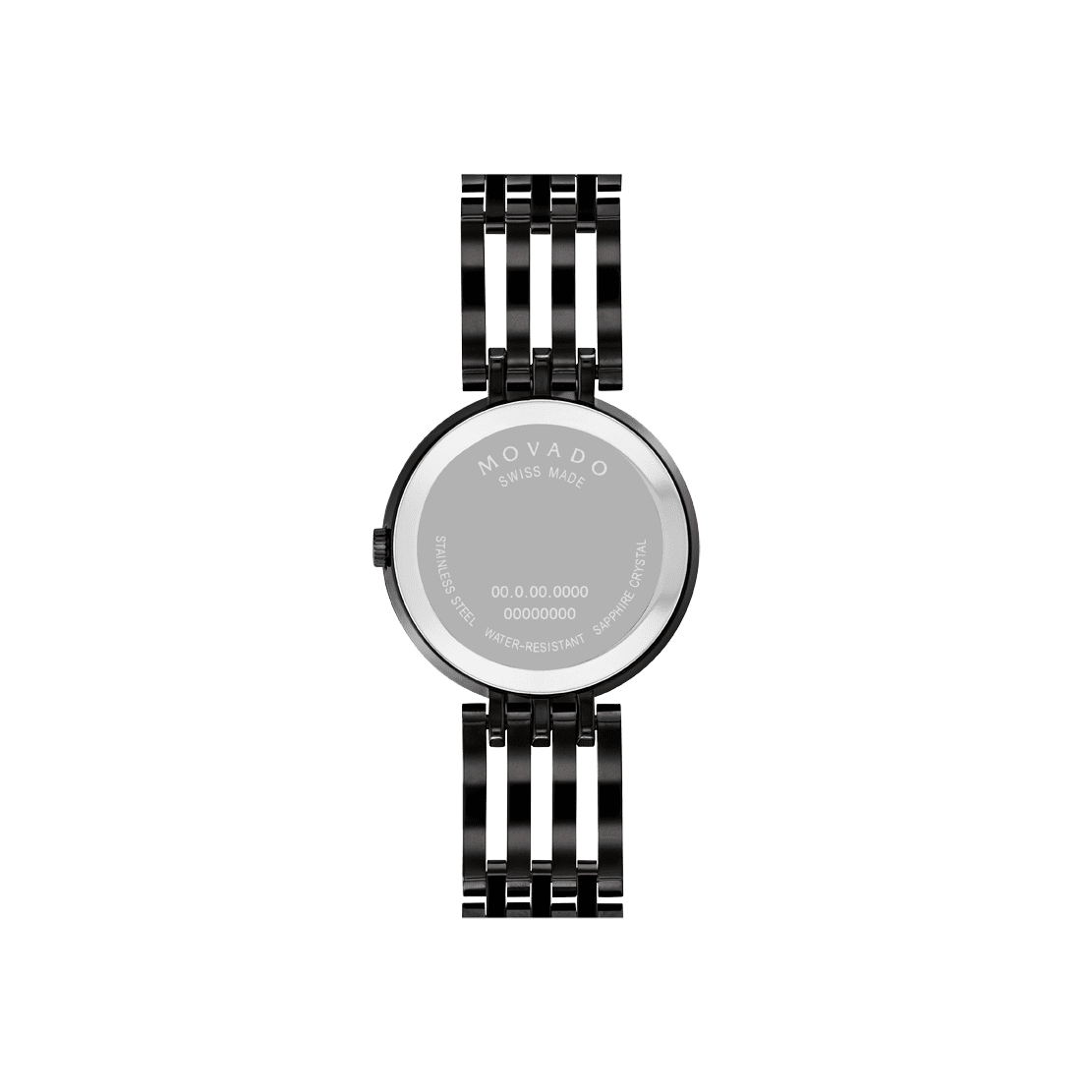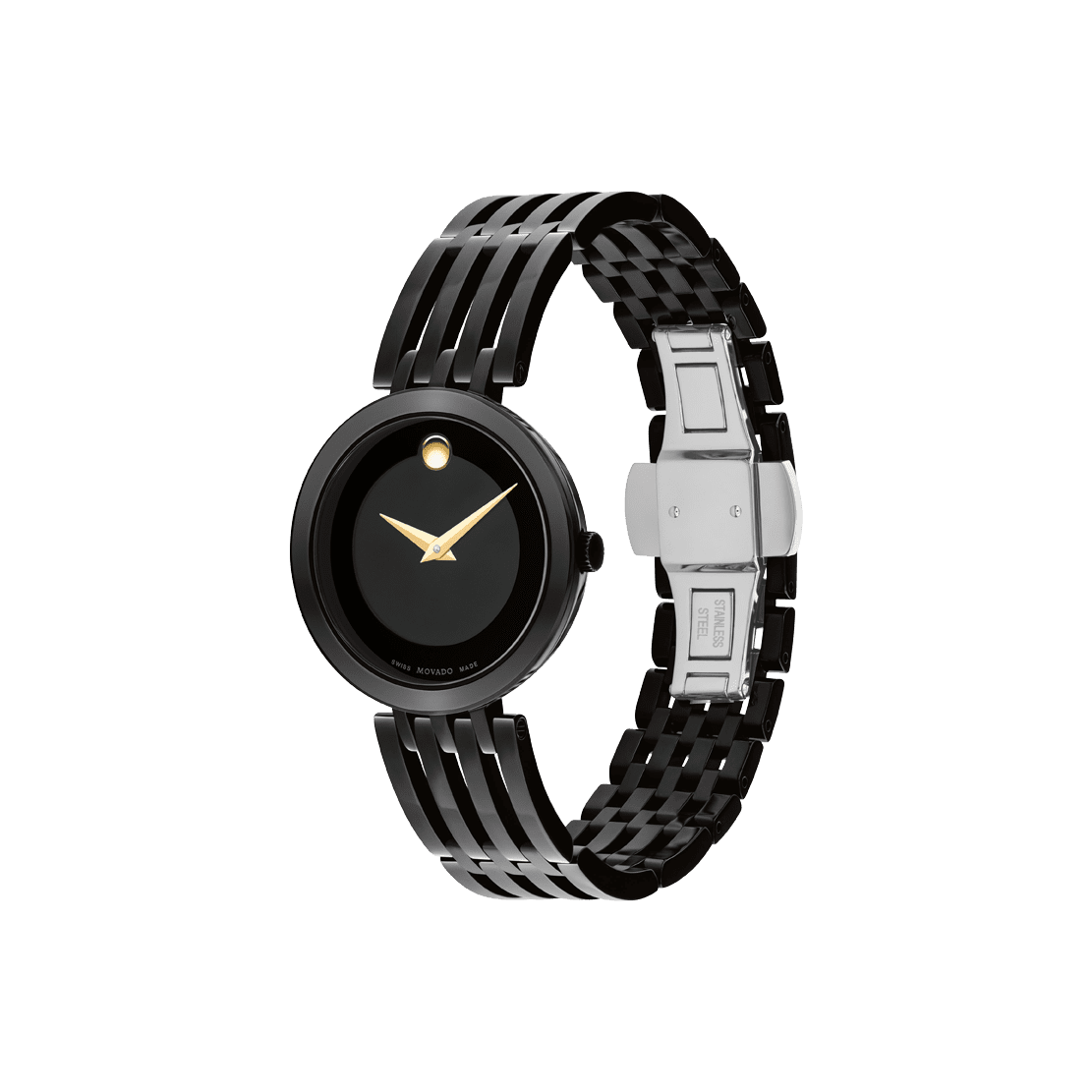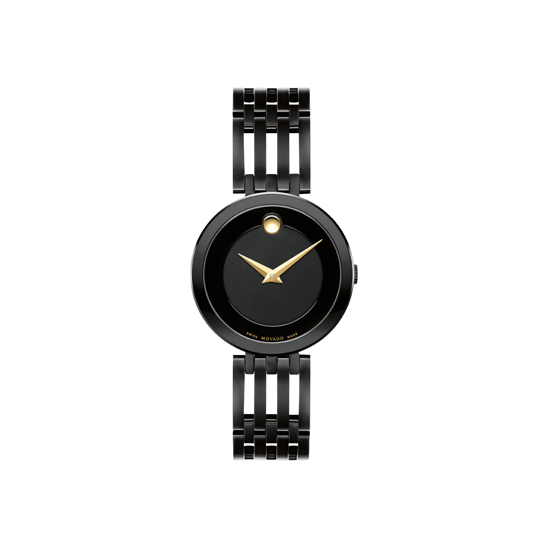Modern, geometric lines and wrist-conforming free-falling links define this iconic design. Its signature bracelet and petite 28mm case are crafted from chic monochromatic black PVD. A lacquer-finished outer ring frames the matching black dial, equipped with gleaming yellow gold-toned hands and our iconic dot.
