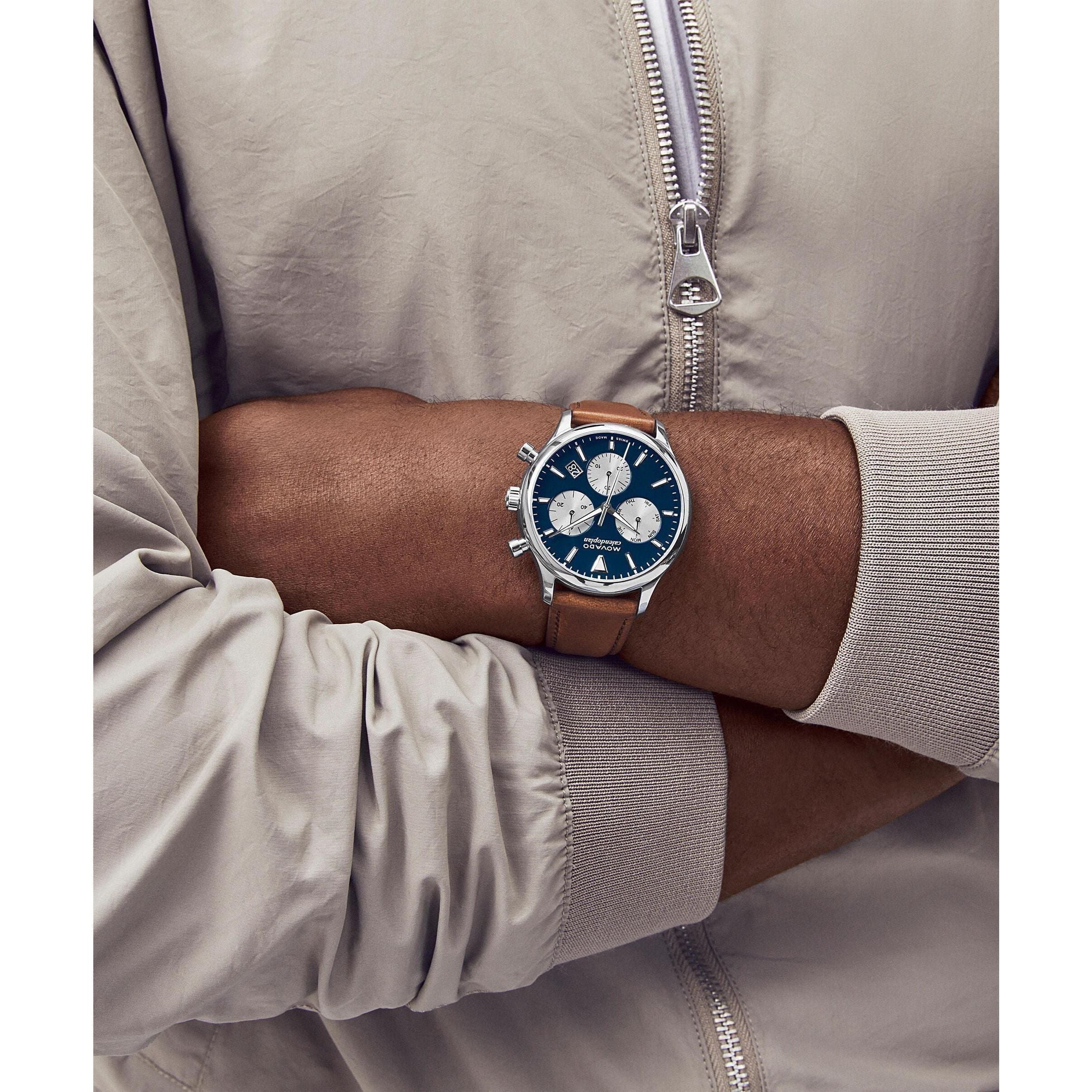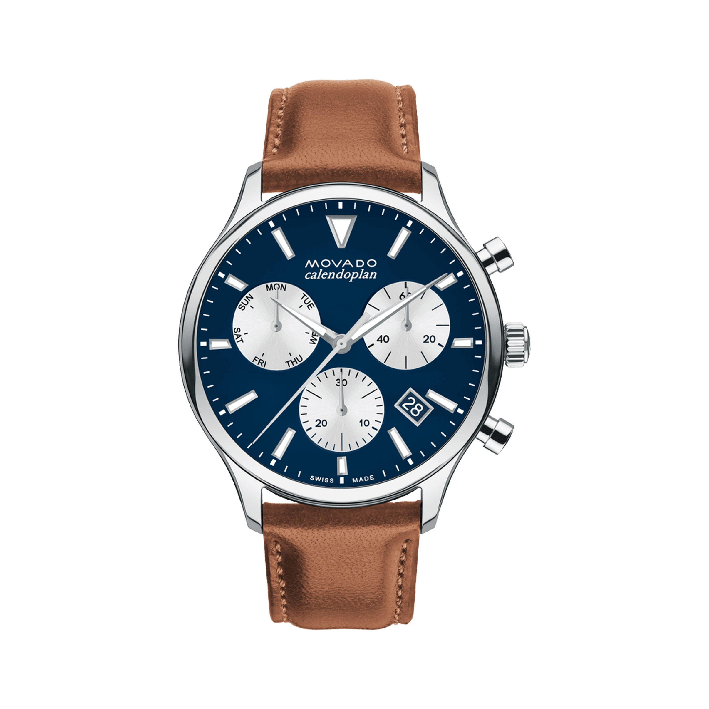 First introduced in 1950, the Movado Calendoplan captures the soul of mid-century design with contemporary details. This timeless chronograph timepiece is inspired by our archives and features a 43mm stainless steel case framing a blue dial outfitted with three grey-toned subdials, Swiss Super-LumiNova® accents and a date window.
