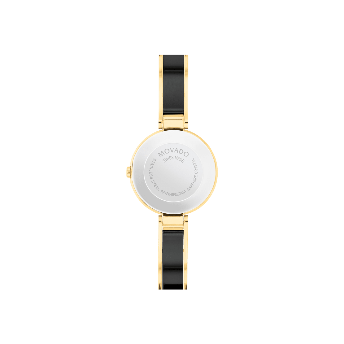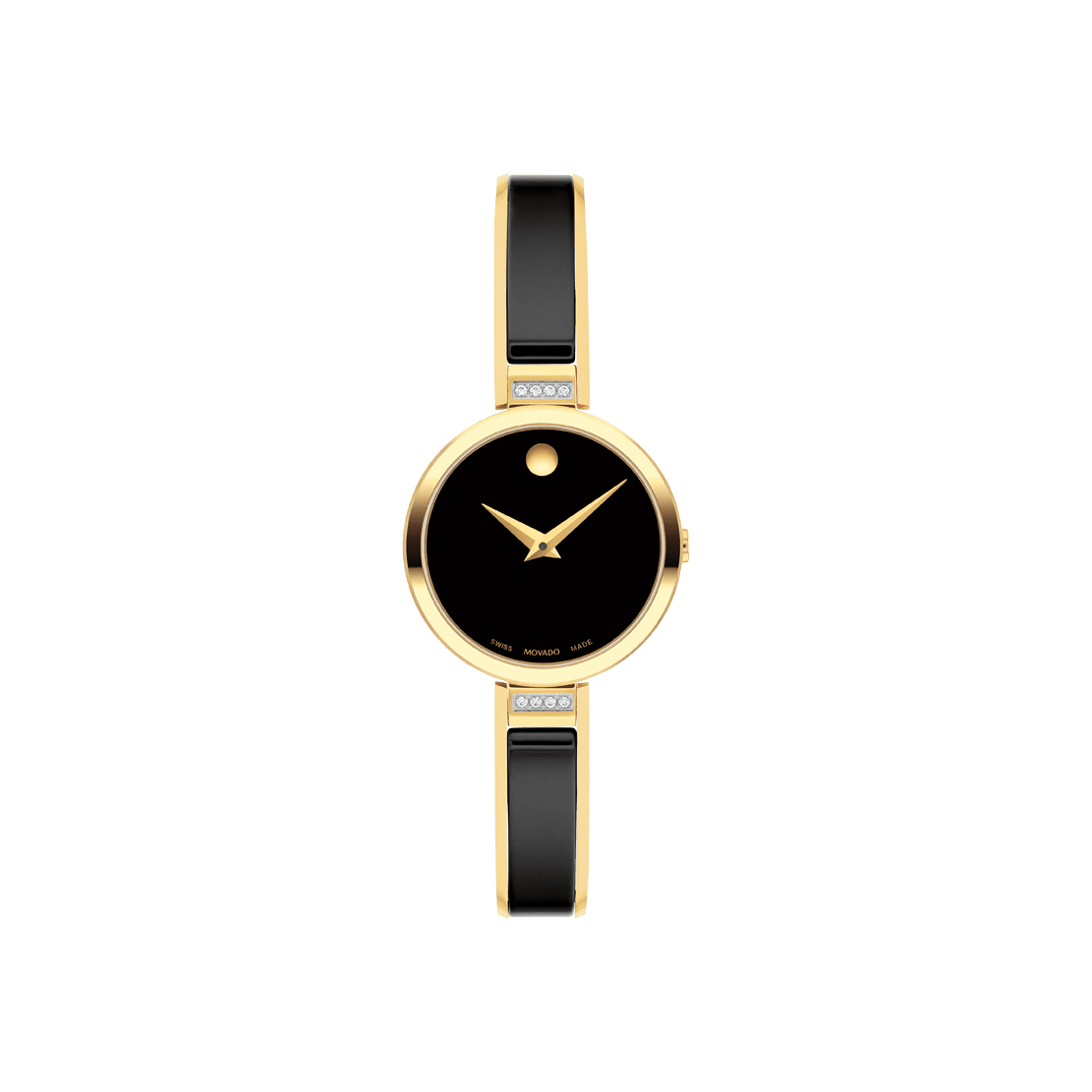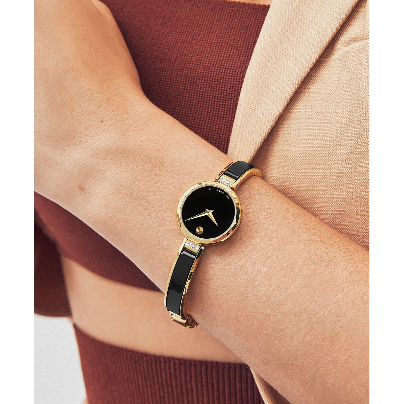 Redefining modern elegance. Iconic design meets feminine style in our new Moda Collection. This sophisticated bangle features a slim yellow gold PVD-finished bracelet and sleek black ceramic inlay paired with a chic 24mm case framing our signature Museum dial. A row of sparkling diamonds frames the case to create the ultimate in contemporary luxury. A jewelry clasp closure completes the design.
