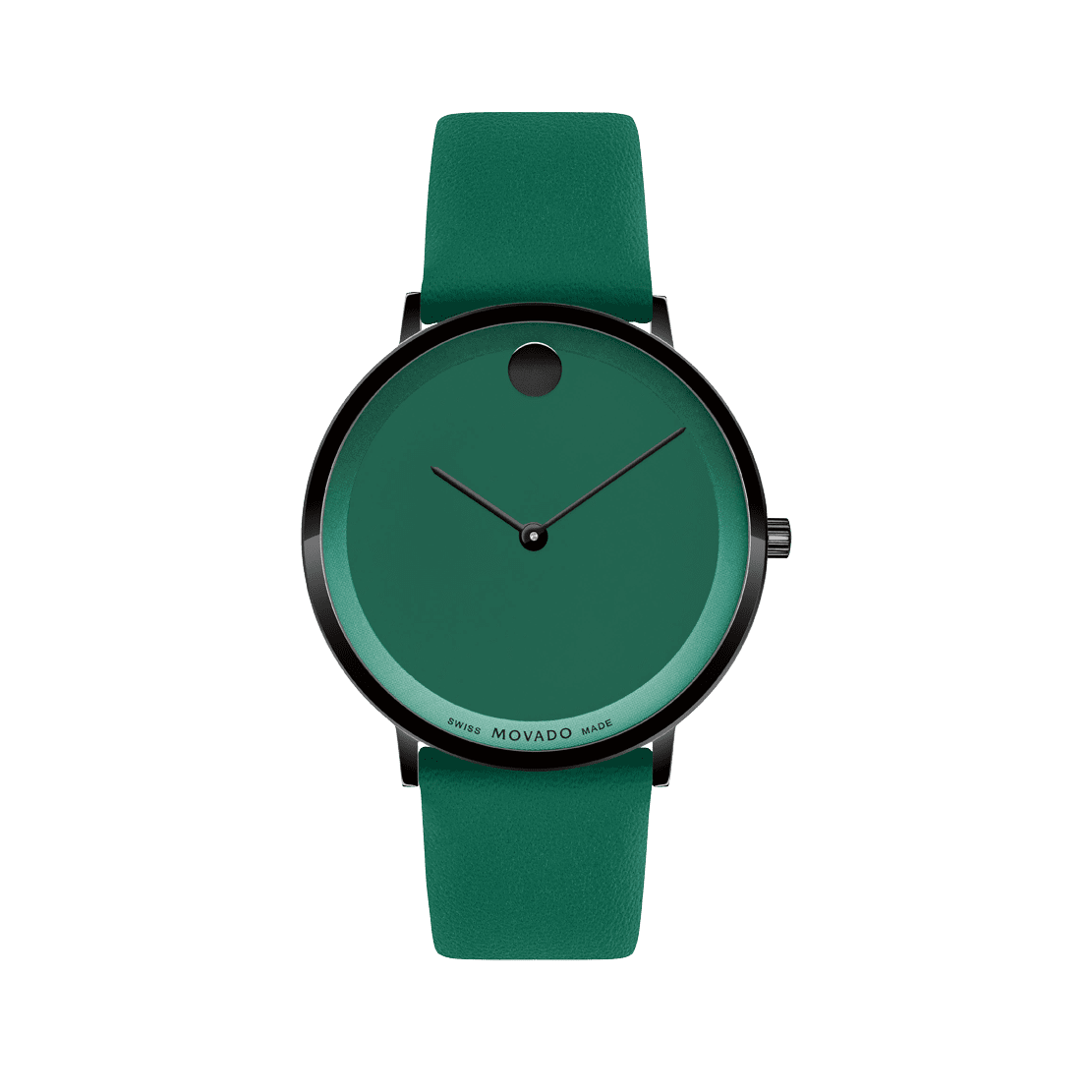 Exclusively at Movado, A colorful, modern take on our most iconic design. This Modern 47 watch pairs monochromatic minimalism with sleek, black accents. The dial and luxe leather strap are cast in an eye-catching green while it’s statement-making 40mm case, signature dot motif, slender hands, and buckle closure boast a...