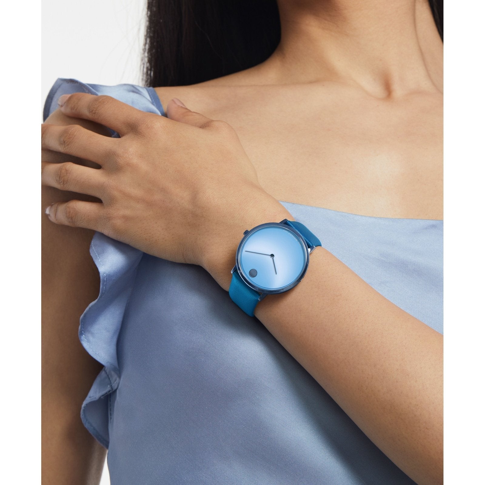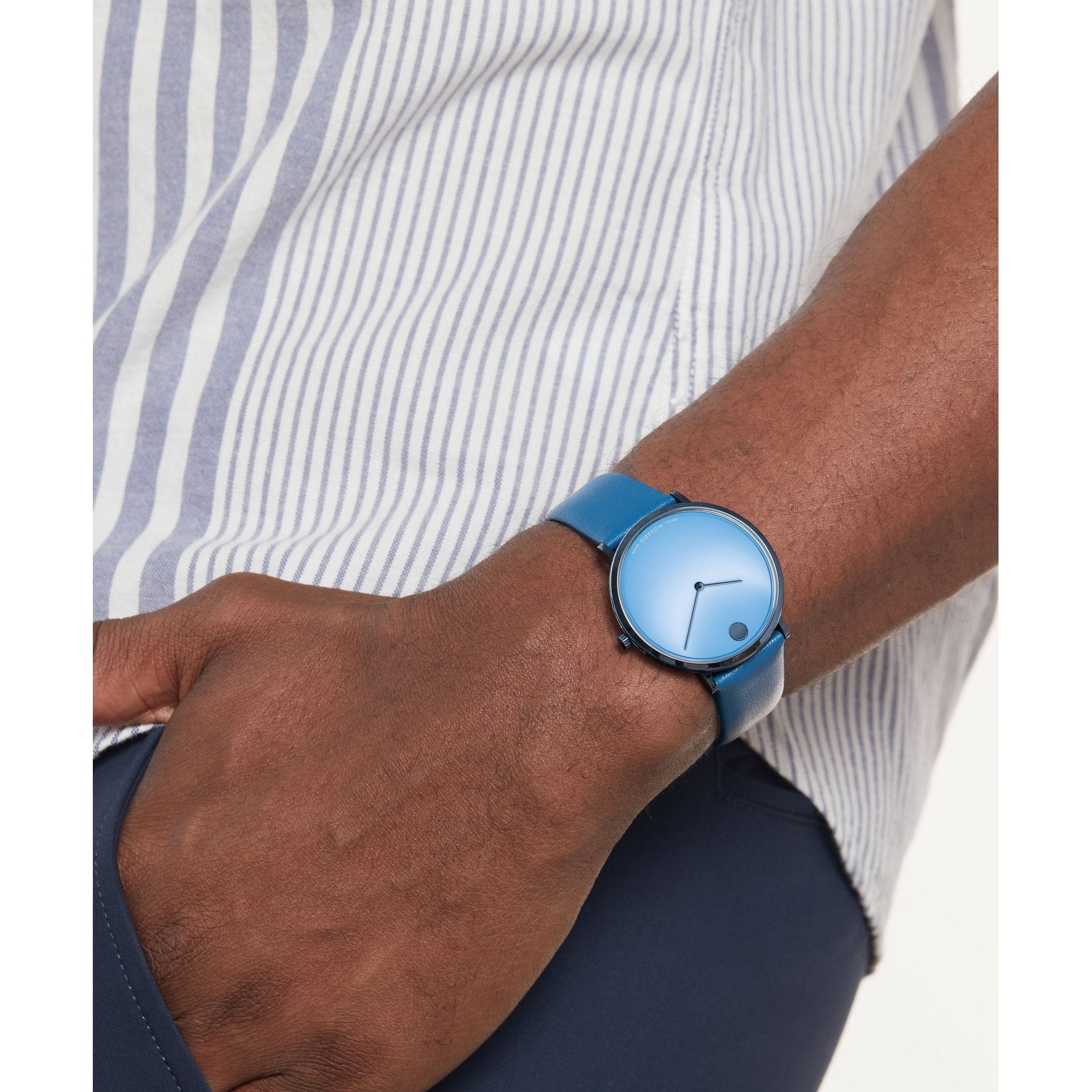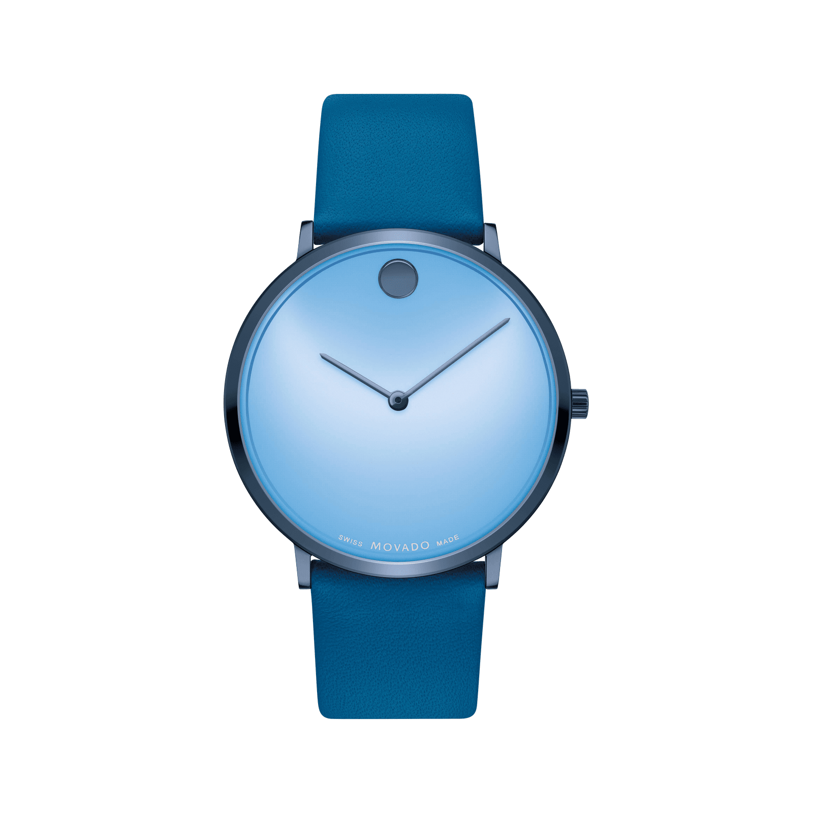 Exclusively at Movado, A colorful, modern take on our most iconic design. This Modern 47 watch pairs sleek minimalism with a stunning blue ombré dial. Its statement-making 40mm case, slender hands, and signature dot motif are cast in a blue PVD-finished stainless steel for visual contrast. A perfectly matched strap crafted from luxurious leather completes the design.