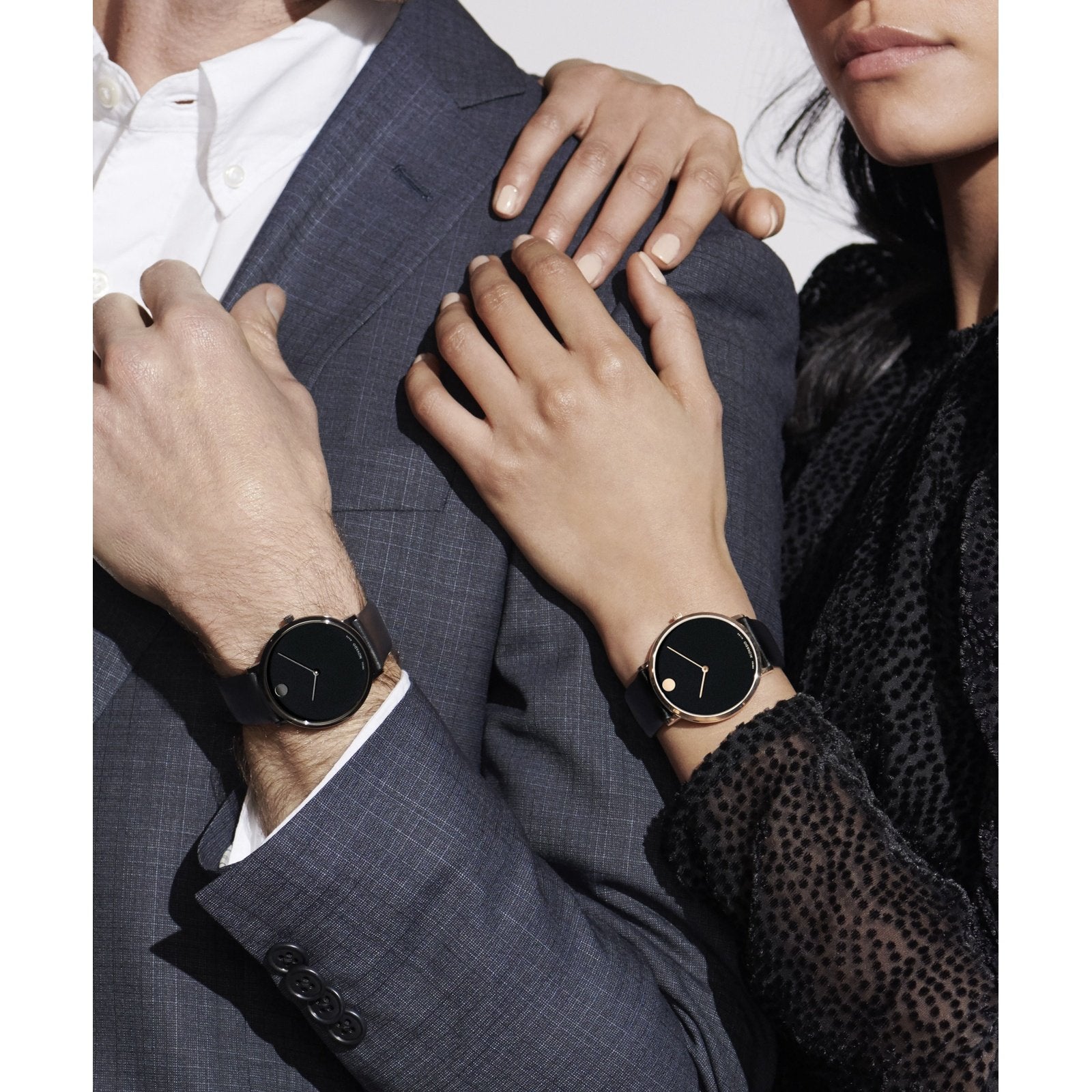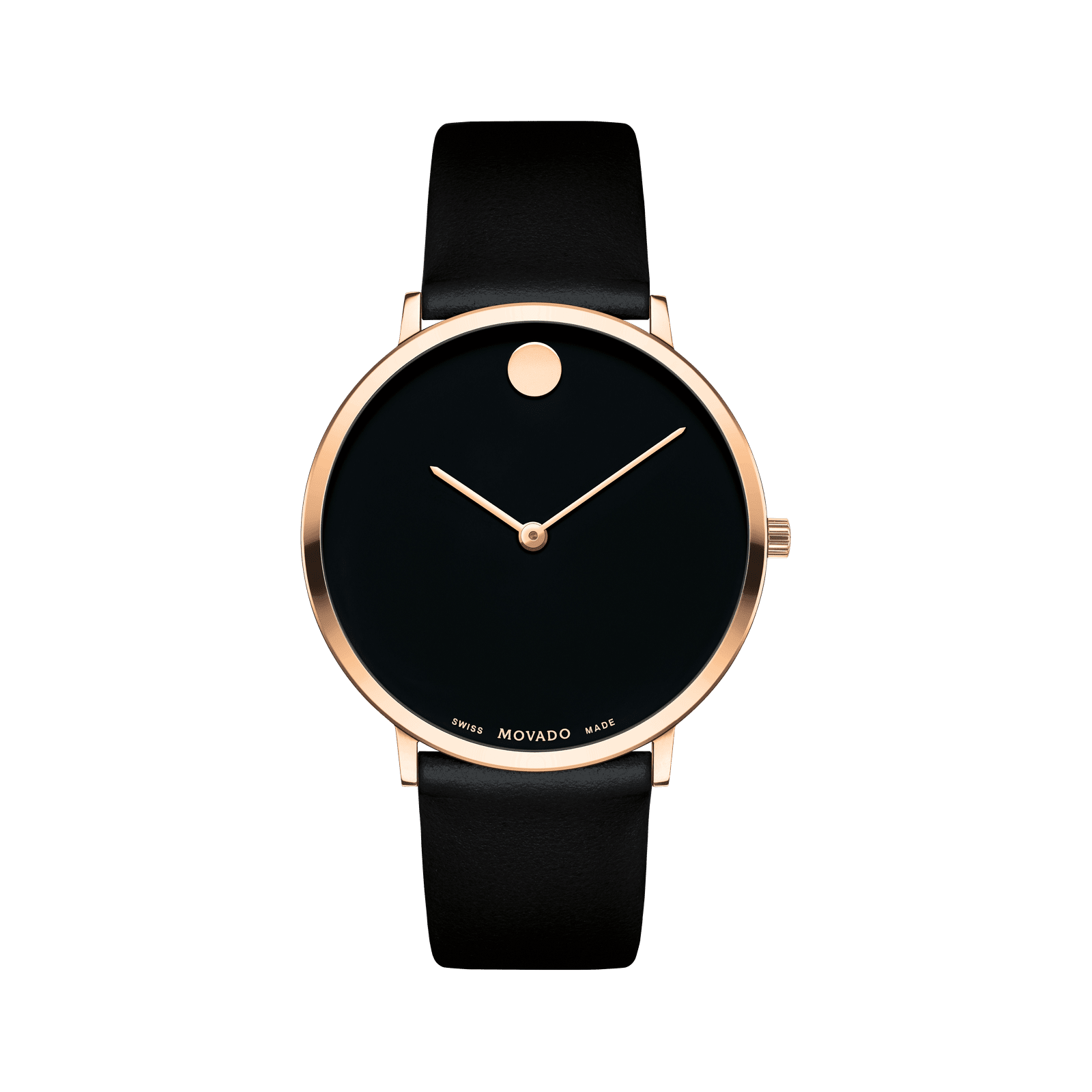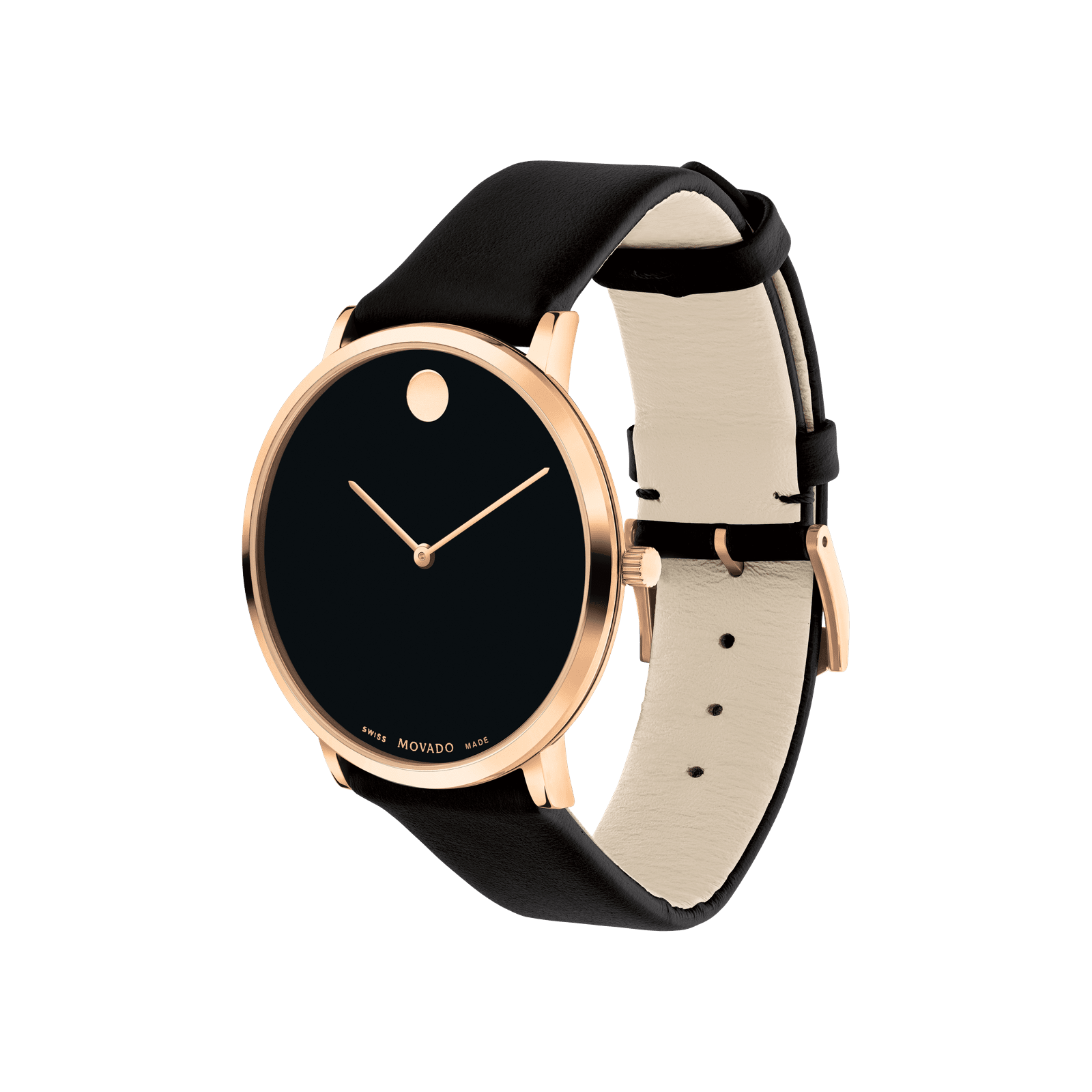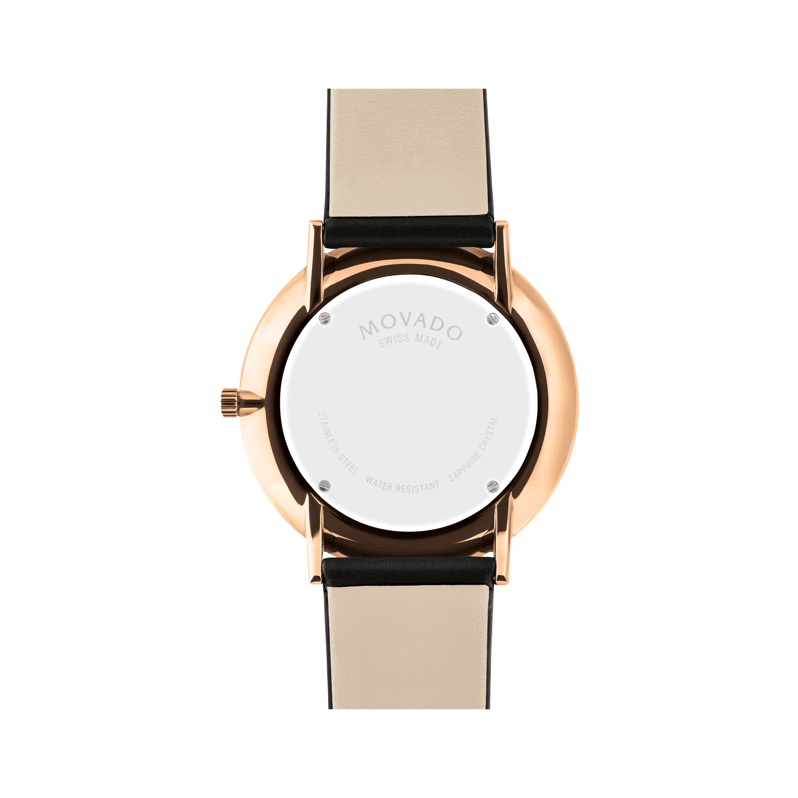 Go to the shopMovado.com EXCLUSIVE Modern 47, 40 mm rose gold PVD-finished stainless steel case with black-toned dial on black leather strap.