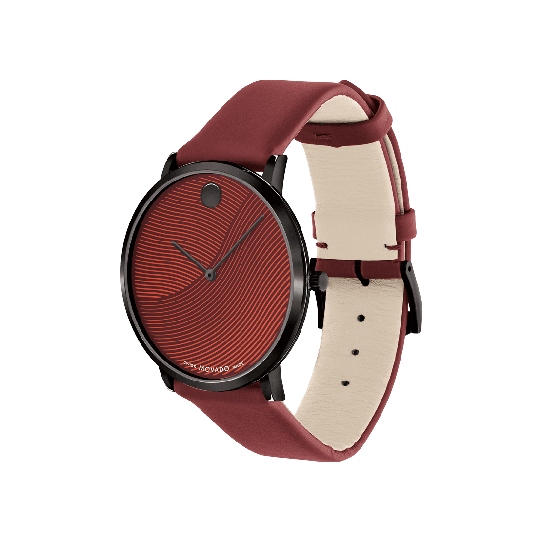 Movado.com EXCLUSIVE, Modern 47, 40mm black PVD-finished stainless steel case with a merlot sand dune-inspired dial on a merlot leather strap.