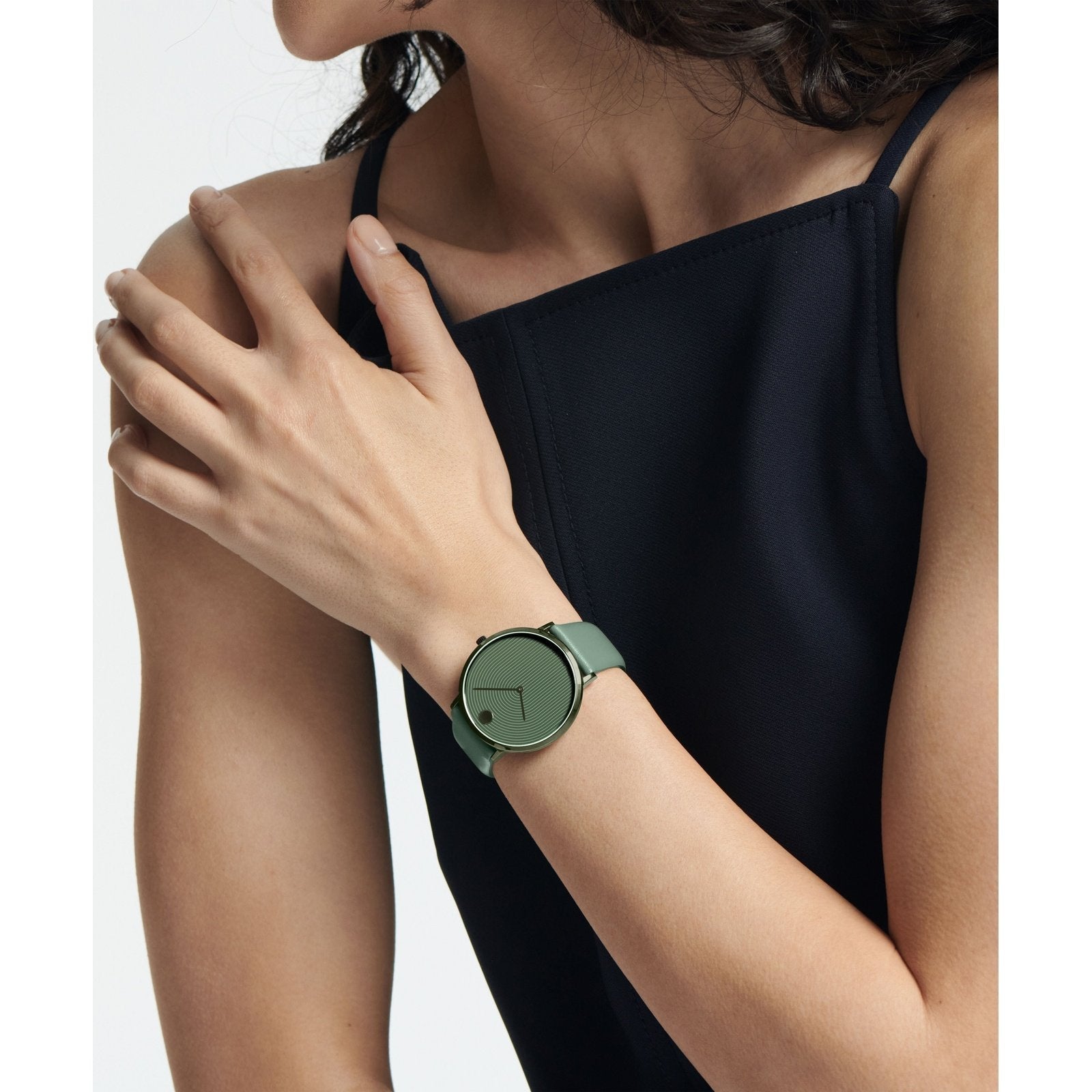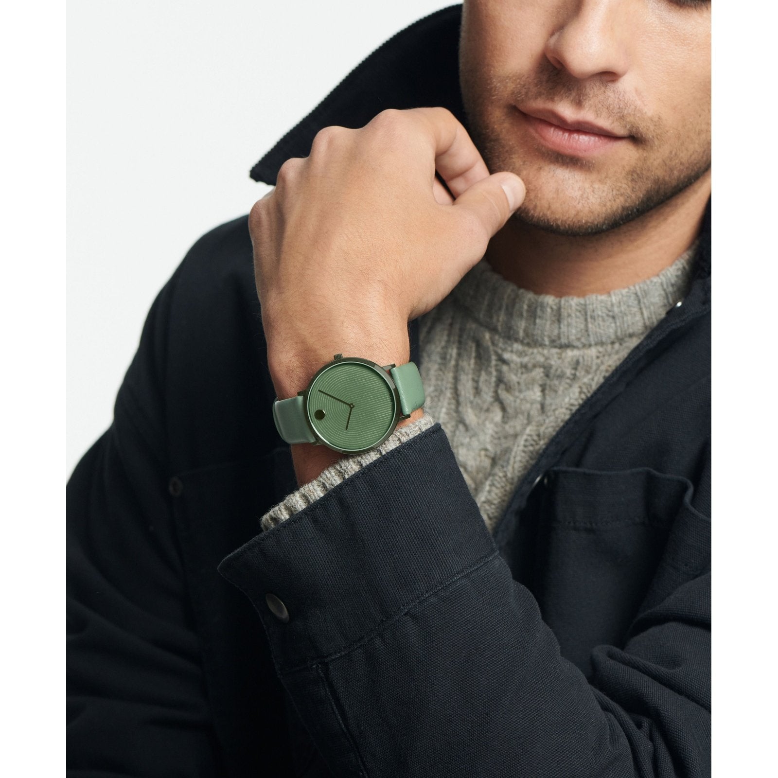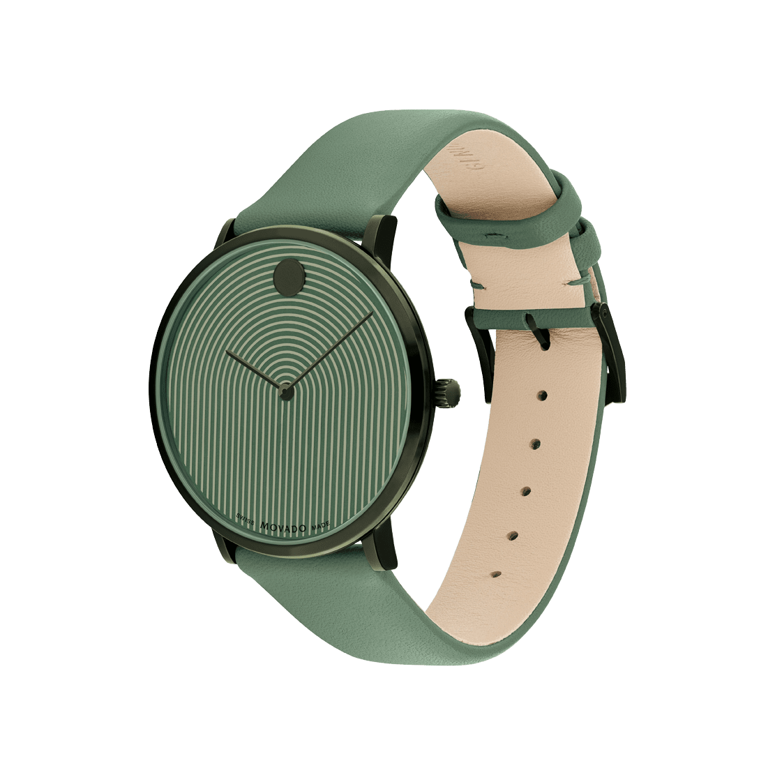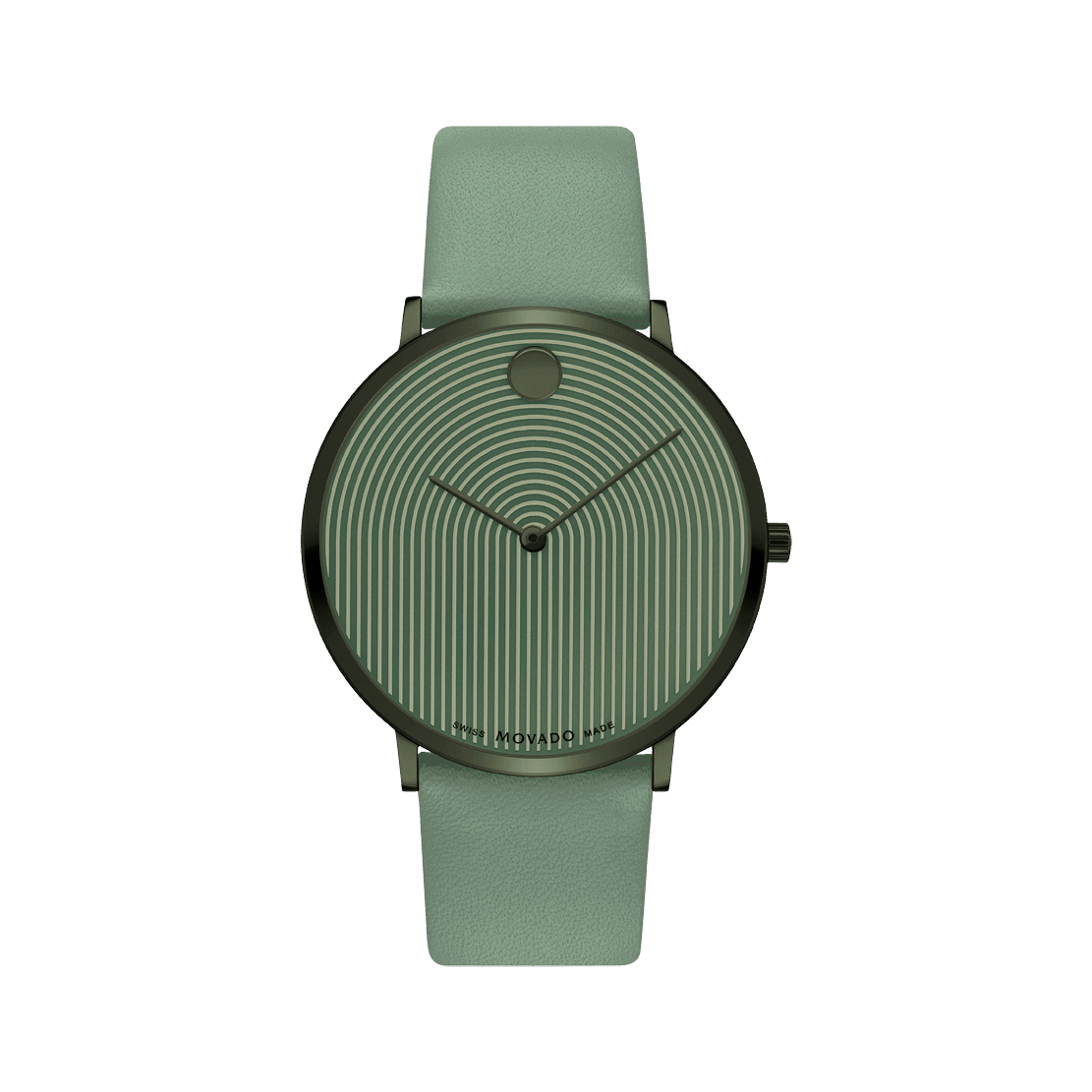 Exclusively at Movado, A colorful, modern take on our most iconic design. This Modern 47 watch pairs monochromatic minimalism with an on-trend arch-patterned dial in verdant fern. It's statement-making 40mm case, slender hands and our signature dot motif are cast in green PVD. A perfectly matched strap crafted from luxurious...
