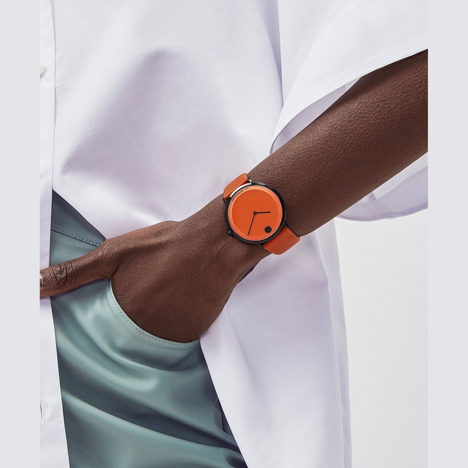 Exclusively at Movado, A colorful, modern take on our most iconic design. This Modern 47 watch pairs monochromatic minimalism with sleek, black accents. The dial and luxe leather strap are cast in a vibrant orange while it’s statement-making 40mm case, signature dot motif, slender hands, and buckle closure boast a glossy black PVD finish.