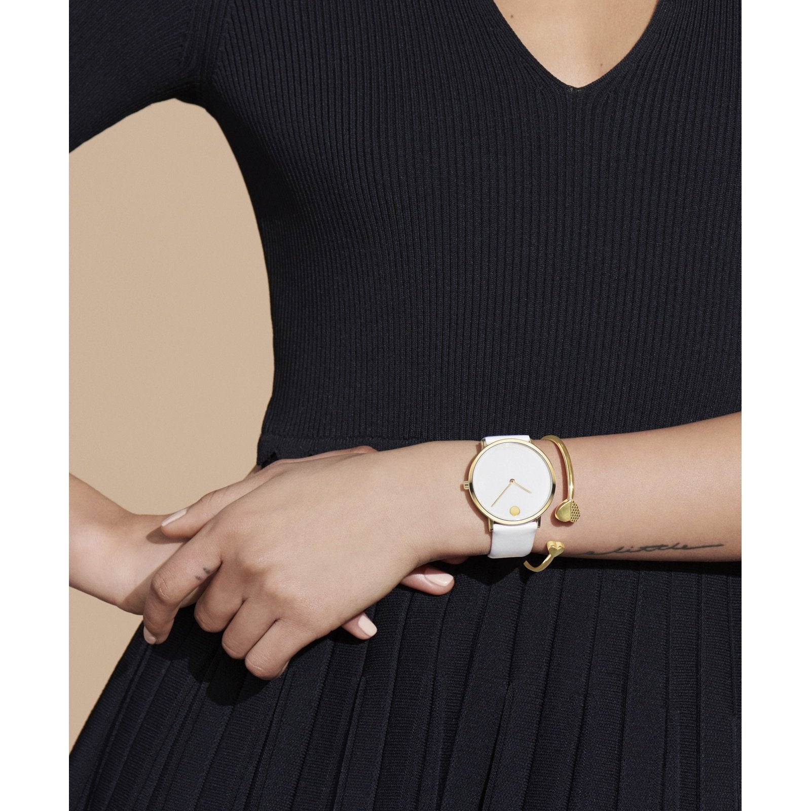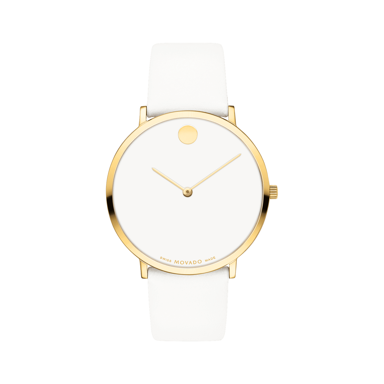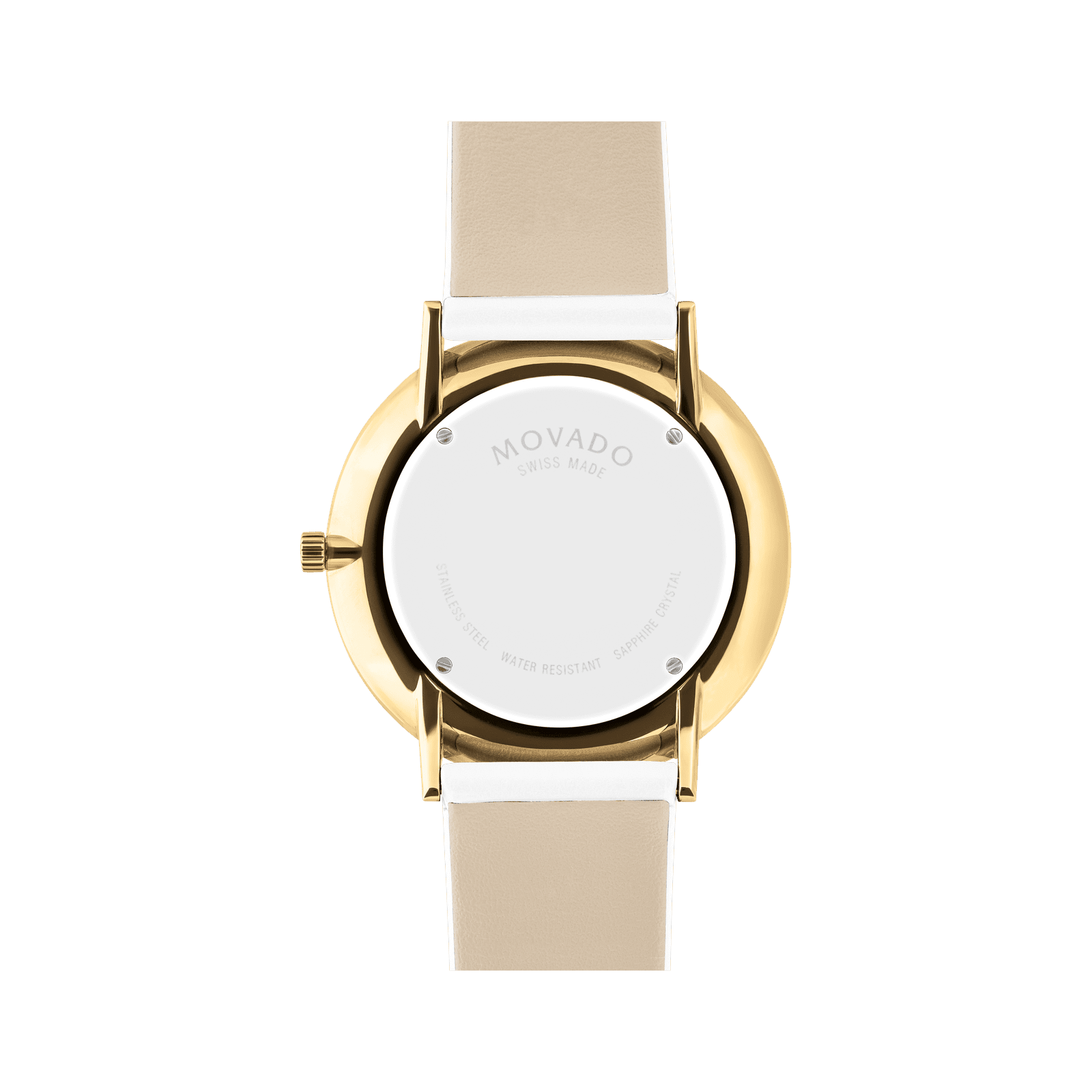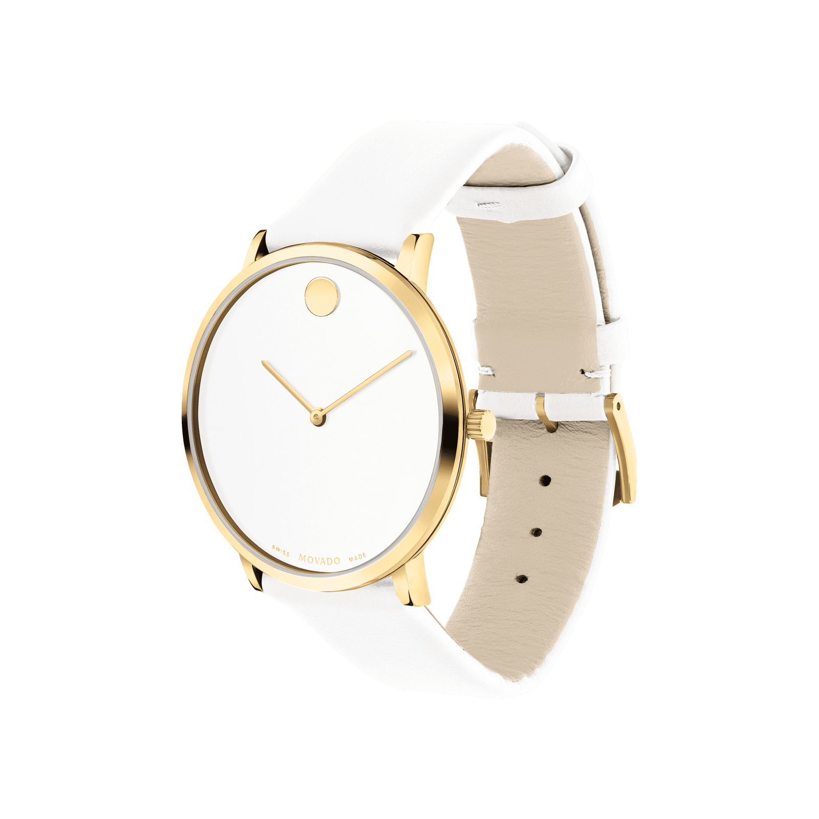 Go to the shopMovado.com EXCLUSIVE Modern 47, 40 mm yellow gold PVD-finished stainless steel case with white-toned dial on white leather strap.