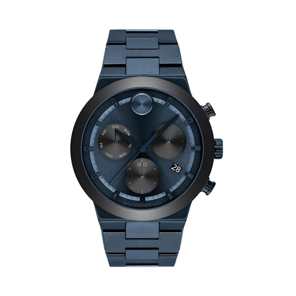 Movado BOLD Fusion, 44mm blue ion-plated stainless steel case and bracelet with a blue and black accented chronograph dial, ceramic bezel and date window detailing.